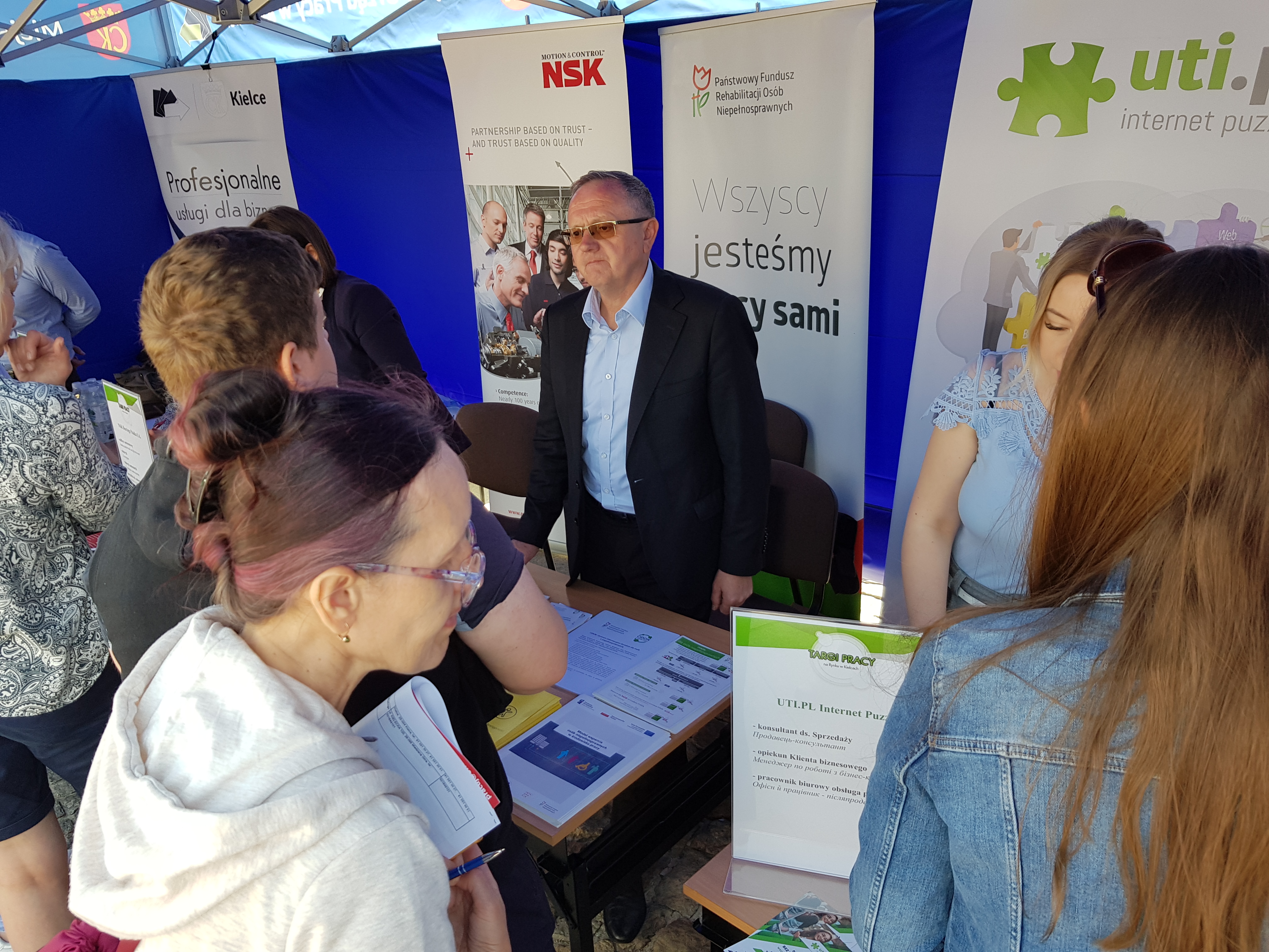 23 maja br. na kieleckim rynku odbyły się Targi Pracy. Organizatorami wydarzenie był: Miejski Urząd Pracy i Powiatowy Urząd Pracy w Kielcach. Celem targów była pomoc pracodawców w znalezieniu kandydatów do pracy o poszukiwanych kwalifikacjach, a osobom bezrobotnym i poszukującym pracy pomoc w uzyskaniu odpowiedniego zatrudnienia. W Targach wzięło udział kilkaset osób szukających zatrudnienia. Swoje stoisko wystawił także Oddział Świętokrzyski PFRON. Dyrektor Oddziału Andrzej Michalski odpowiadał na wszystkie pytania zadawane przez poszukujących zatrudnienia oraz przekazywał informacje o realizowanych obecnie projektach w ramach zadań zlecanych: „W kierunku -wejście osób z niepełnosprawnością na rynek pracy”.