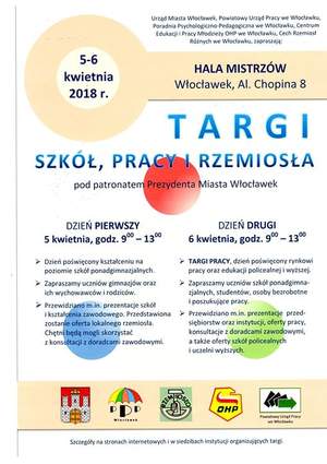 Organizatorzy targów - Urząd Miasta Włocławek, Powiatowy Urząd Pracy w Włocławku, Poradnia Psychologiczno-Pedagogiczna we Włocławku, Centrum Edukacji i Pracy Młodzieży OHP we Włocławku oraz Cech Rzemiosł Różnych we Włocławku zapraszają osoby pragnące kontynuować naukę oraz podnieść swoje kwalifikacje i osoby poszukujące pracę do odwiedzenia targów, które odbędą się w dniach 05-06 kwietnia b.r. w Hali Mistrzów we Włocławku, Al. Chopina 8.