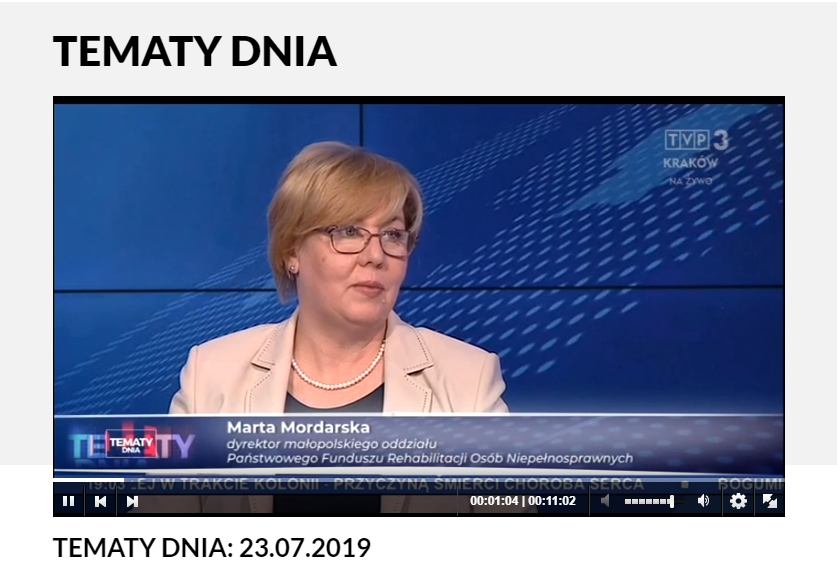 O dostępności i celach nowej ustawy, w programie "Tematy dnia" TVP3 Kraków, opowiedziały wczoraj Urszula Rusecka - Przewodnicząca sejmowej Komisji Polityki Społecznej i Rodziny oraz Marta Mordarska - dyrektor Małopolskiego Oddziału Państwowego Funduszu Rehabilitacji Osób Niepełnosprawnych.