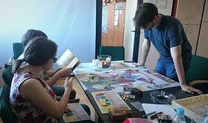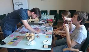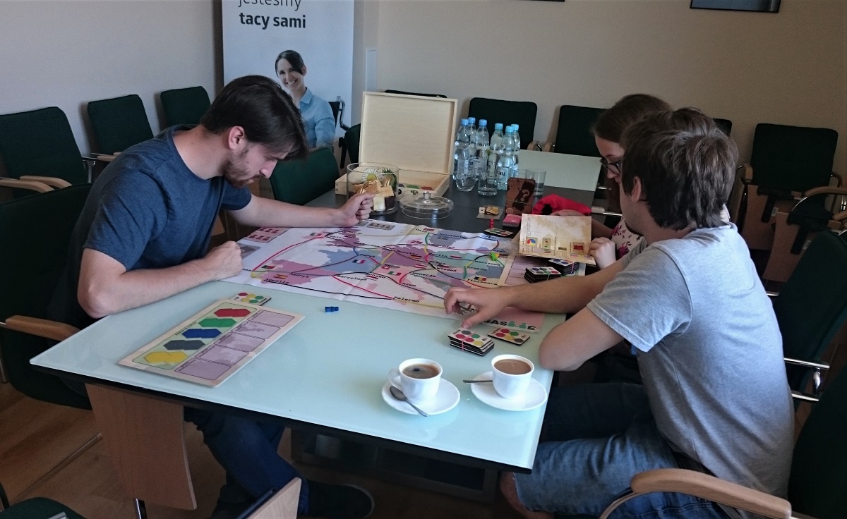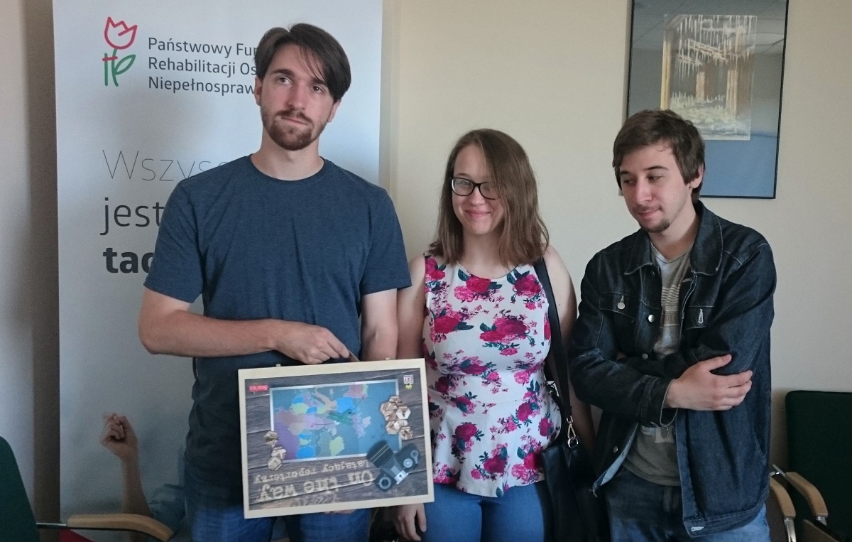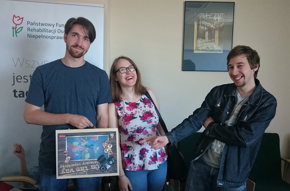 „On the way – Latający reporterzy” to gra planszowa, którą testowano pod kątem integracyjnym i dostosowania do potrzeb osób niedowidzących w Oddziale Małopolskim PFRON. Pilotażowy egzemplarz gry przeanalizowany został przez studentów I roku Socjologii na Wydziale Humanistycznym Akademii Górniczo-Hutniczej w Krakowie: Annę Jackiewicz, Mateusza Krzyszkowskiego oraz Błażeja Kłosowskiego. Wszyscy mają duże doświadczenie w grach planszowych. Mateusz Krzyszkowski jest osobą słabowidzącą z 80% utratą ostrości widzenia w centralnej części pola. Na co dzień jest członkiem klubu Tyniecka NWP Kraków, w maju br. reprezentował Polskę podczas międzynarodowego turnieju piłki nożnej osób niewidomych - 3rd IBSA Blind Football Euro Challenge Cup 2018.