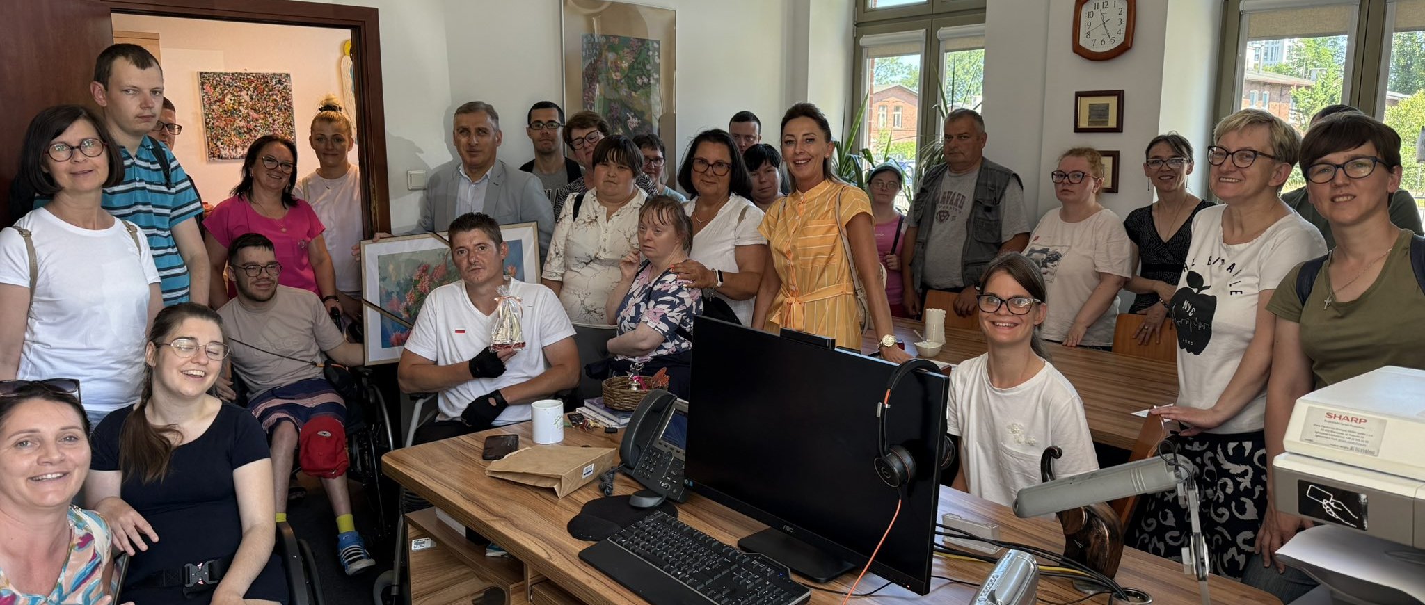 W ramach podziękowania goście z WTZ Chmielno przywieźli własnoręcznie wykonaną pracę plastyczną, którą z przyjemnością powiesiliśmy w siedzibie Oddziału. Spotkanie stało się także okazją do przeprowadzenia wywiadu z naszym Dyrektorem – uczestnicy warsztatu od lat realizują autorski cykl rozmów z osobami, które są dla nich szczególnie ważne i inspirujące.