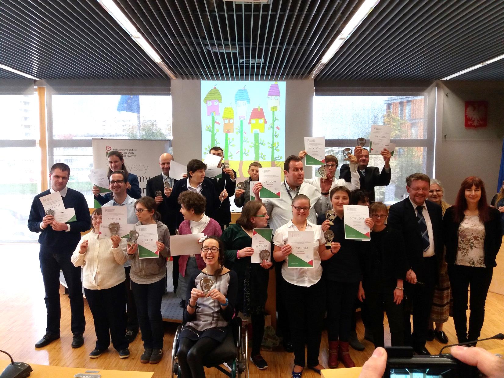 Wspólna fotografia laureatów opolskiego etapu XV Ogólnopolskiego Konkursu Plastycznego „Sztuka Osób Niepełnosprawnych”