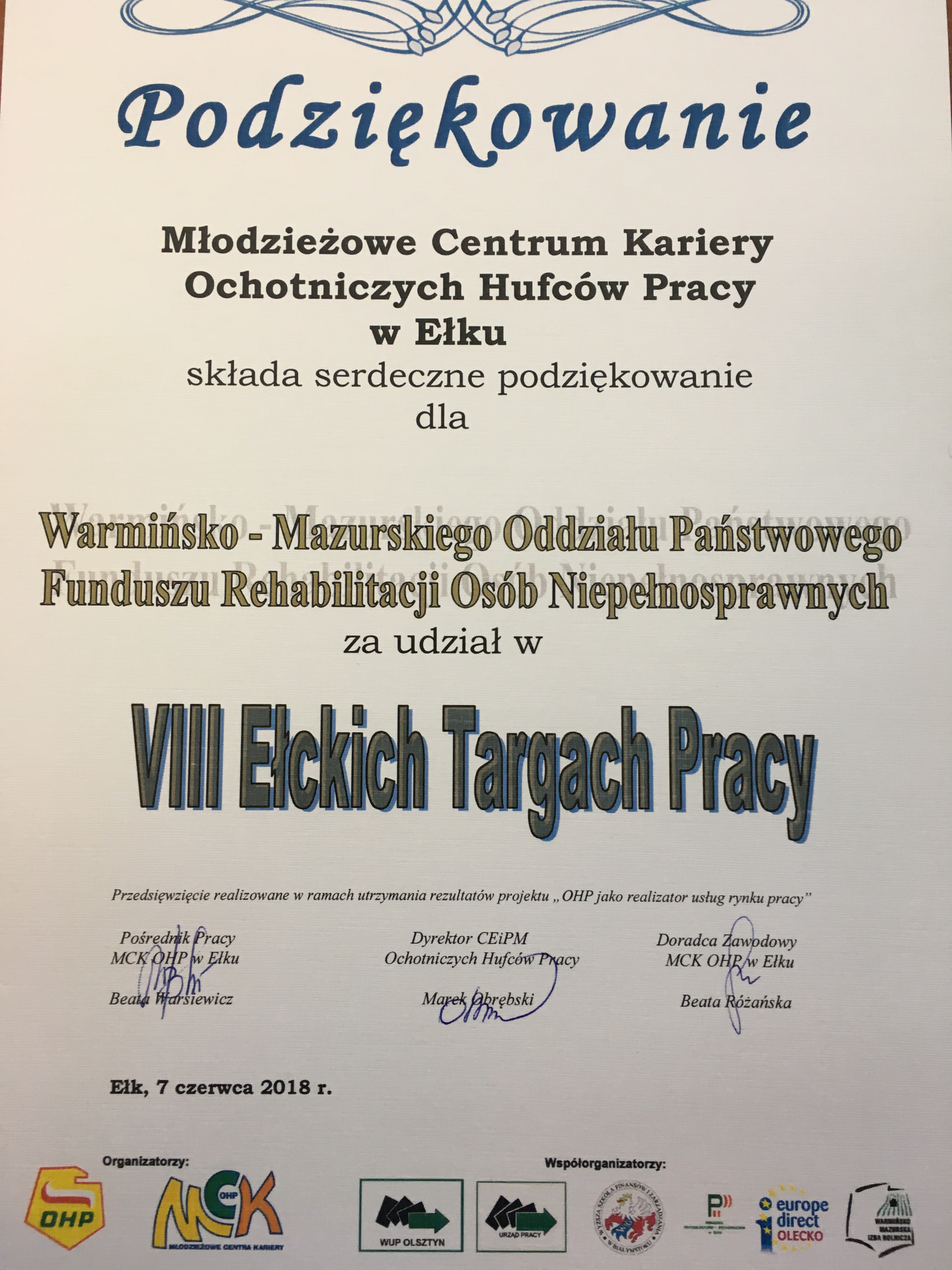 Wyższa Szkoła Finansów i Zarządzania w Białymstoku Filia w Ełku w dniu 07 czerwca 2018 zorganizowała VIII Ełckie Targi Pracy w Ełku. Patronat honorowy nad targami objął Wojewoda Warmińsko-Mazurski, Prezydent Miasta Ełku oraz Starosta Powiatu Ełckiego. Uczestnikami wydarzenia byli m. in.: Młodzieżowe Centrum Kariery OHP w Ełku, Wyższa Szkoła Finansów i Zarządzania w Białymstoku Filia w Ełku, Stanowisko Zamiejscowe w Ełku WUP w Olsztynie, Powiatowy Urząd Pracy w Ełku, Poradnia Psychologiczno-Pedagogiczna w Ełku, Punkt Informacji Europejskiej Europe Direct w Olecku.