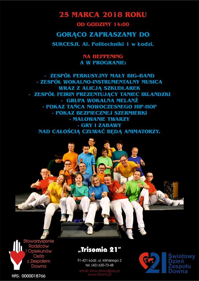 Stowarzyszenie Rodziców i Opiekunów Osób z Zespołem Downa „Trisomia 21” w Łodzi gorąco zaprasza na heppening w dniu 25 marca 2018r. od godziny 14 w galerii handlowej SUKCESJI przy Al. Politechniki 1 w Łodzi.
