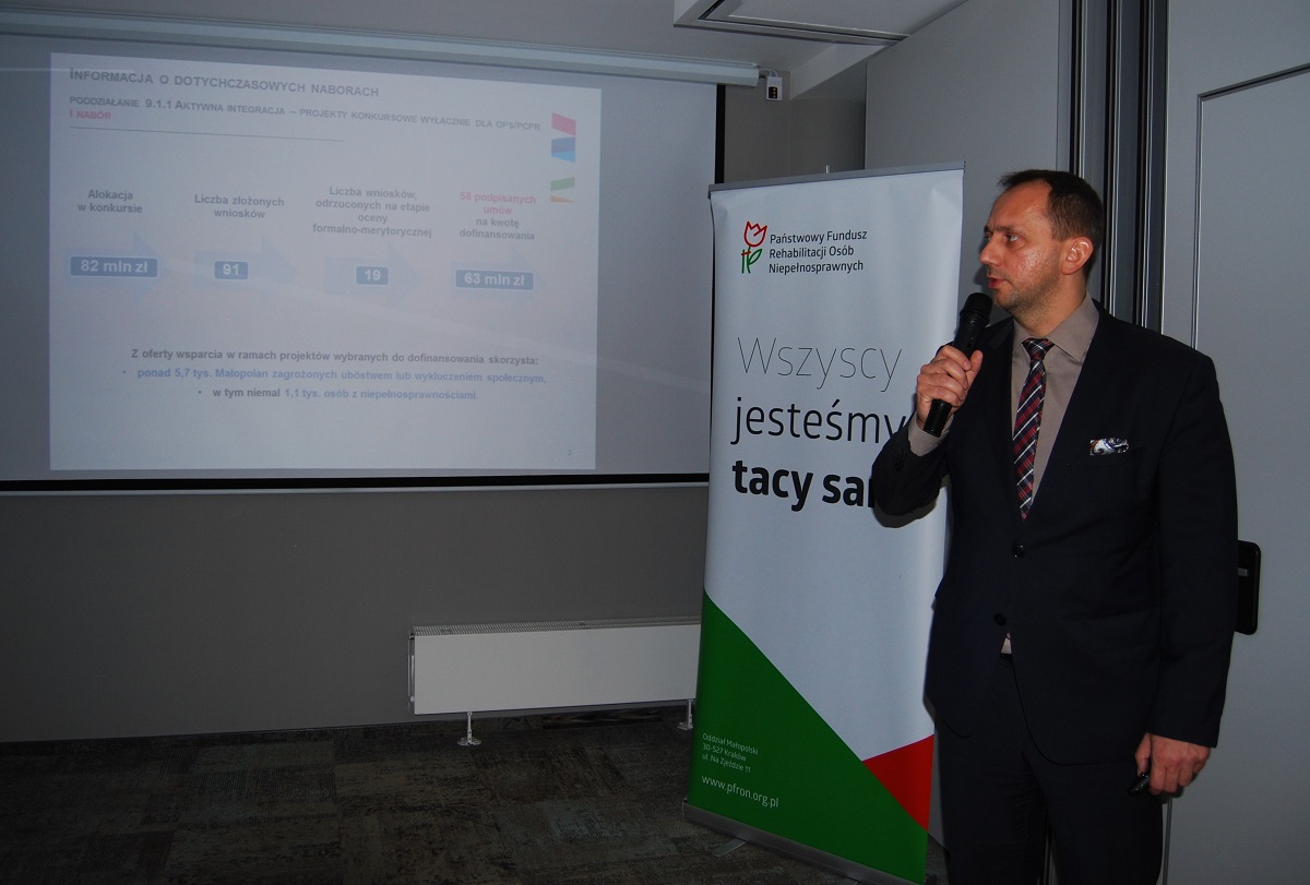 Na temat możliwości pozyskiwania środków w ramach wdrażania funduszy europejskich z Regionalnego Programu Operacyjnego Województwa Małopolskiego mówił Dyrektor Małopolskiego Centrum Przedsiębiorczości –Pan Rafał Solecki. Niezwykle ciekawą część pierwszego dnia Konferencji stanowił „Panel Dobrych Praktyk”. Zaprosiliśmy prelegentów do podzielenia się wartymi upowszechnienia, innowacyjnymi rozwiązaniami. Pani Magdalena Rak -pedagog oraz Dyrektor Józefa Krzysiak ze Szkoły Podstawowej nr 2 im. Jana Pawła w Dobczycach opowiedziały o pierwszej w Małopolsce klasie dla dzieci z autyzmem w szkole masowej. Pani Jadwiga Białoń, Dyrektor ŚDS w Bieczu w ciekawej prezentacji przedstawiła placówkę opieki całodobowej w gorlickiej filii ŚDS. Pani Anita Parszewska z Regionalnego Ośrodka Polityki Społecznej w Krakowie przedstawiła 5 innowacji wyłonionych w projekcie Małopolski Inkubator Innowacji Społecznych. Każdy z pomysłów jest niezwykle inspirujący. Panel zakończyli dyrektorzy placówek, które realizują program Rehabilitacja 25+ - Pani Ewa Zięba, Dyrektor OREW przy PSONI w Miechowie oraz Pani Marta Kuropeska – Dyrektor pedagogiczny ORW „Gromadka” z Nowego Sącza.