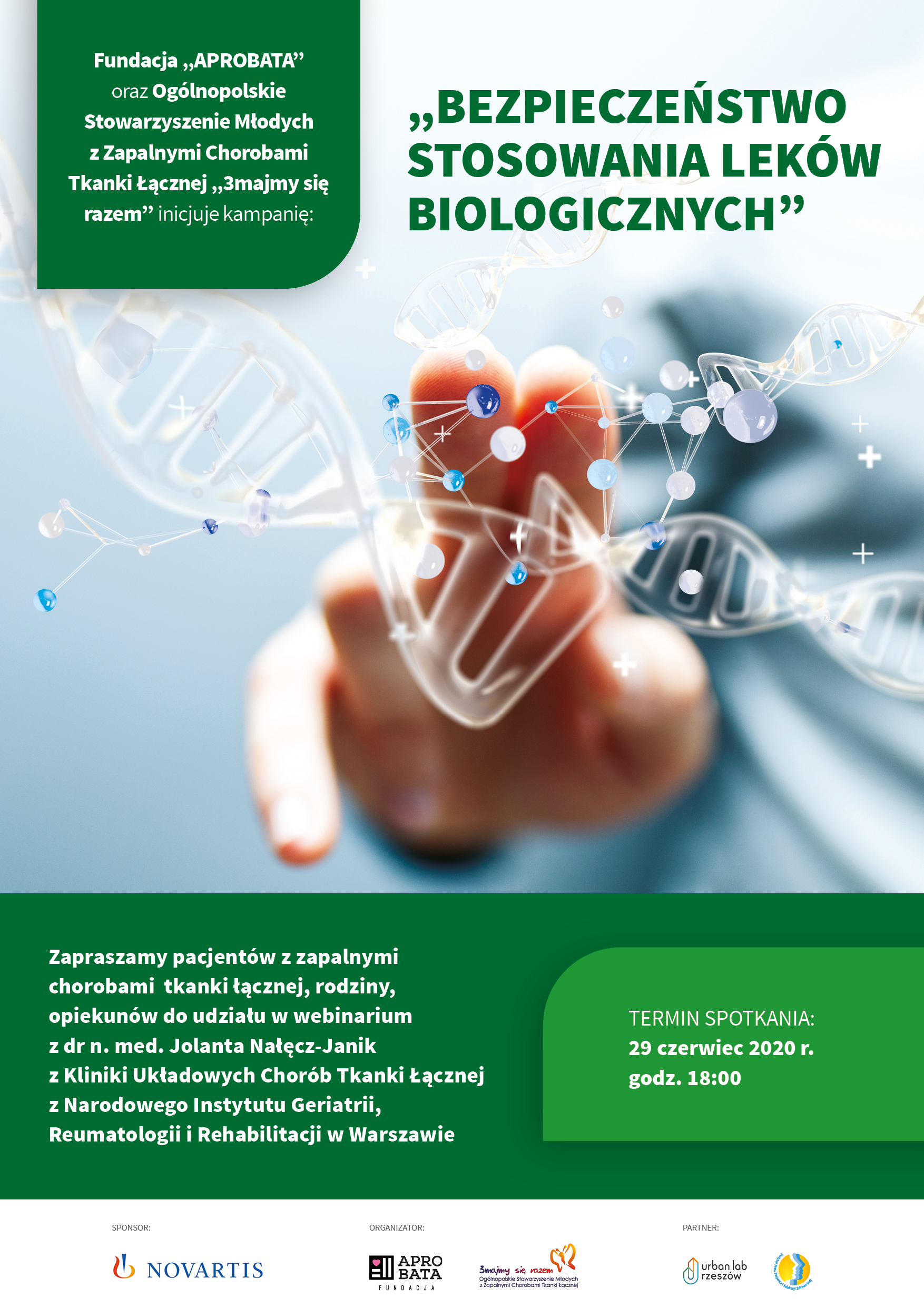 W imieniu Organizatora - Fundacji "APROBATA" oraz Ogólnopolskiego Stowarzyszenia Młodych z Zapalnymi Chorobami Tkanki Łącznej "3majmy się razem"- zapraszamy do udziału w webinarium w ramach kampanii „Bezpieczeństwo stosowania leków biologicznych”.