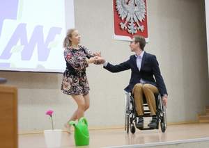 Zgromadzeni goście obejrzeli pokaz „Taniec bez granic” w wykonaniu absolwenta kierunku Fizjoterapia – Mikołaja Szymańskiego oraz studentki kierunku Taniec w kulturze fizycznej – Katarzyny Łapaj, w choreografii pracowników AWF – dr Przemysława Kwarty i mgr Pauliny Wycichowskiej.