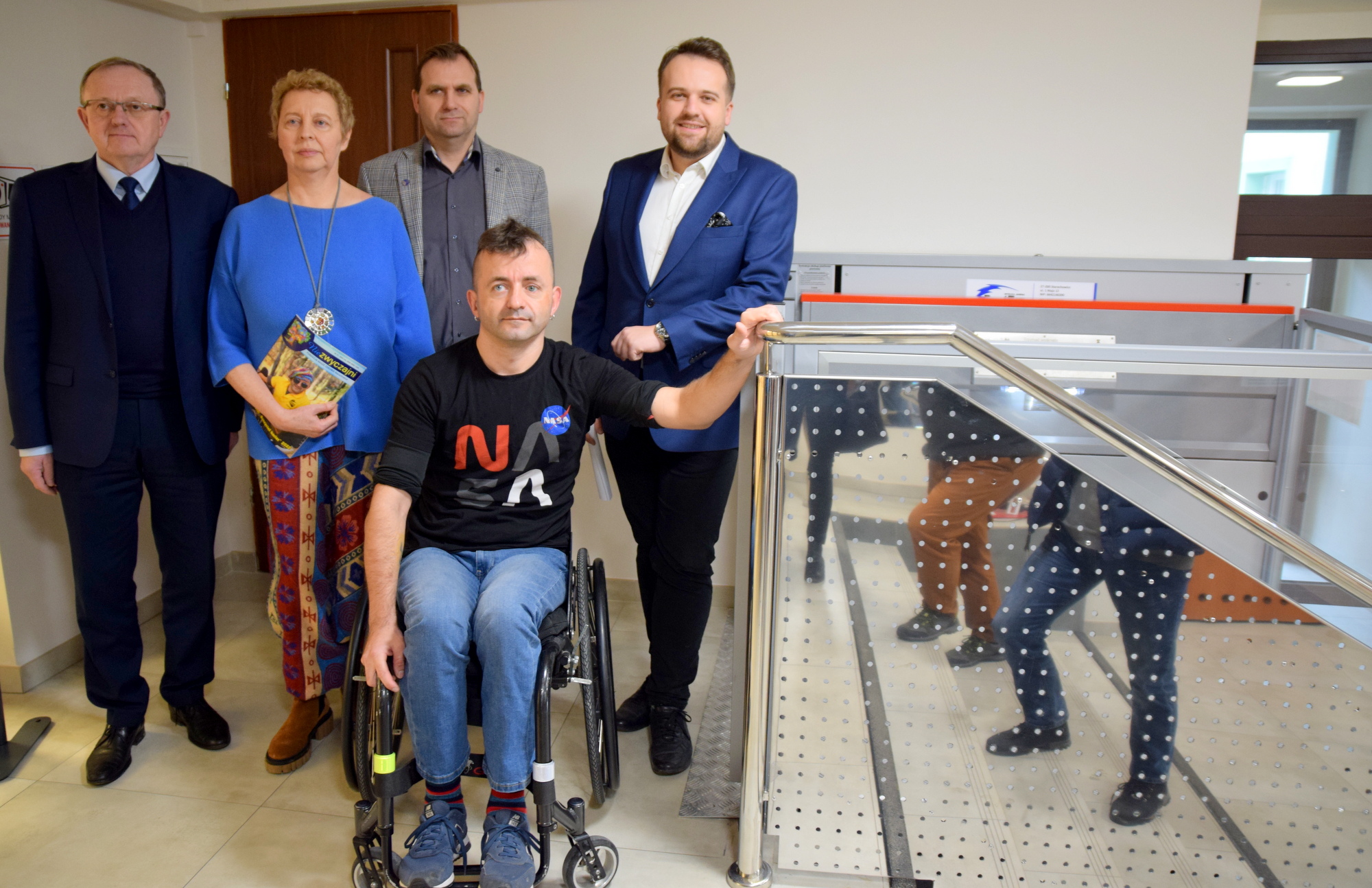 W Urzędzie Miejskim w Starachowicach 18 stycznia br. oficjalnie oddano do użytku pionową windę platformową, która w znaczący sposób ułatwi komunikację w budynku. Montaż pionowej windy platformowej przy wejściu do sali „Olimpia” w Urzędzie Miejskim w Starachowicach został zrealizowany w ramach programu „Wyrównywanie różnic między regionami III finansowanego ze środków PFRON w ramach obszaru B”. Całkowity koszt realizacji tego zadania wyniósł 46 351,57 złotych, w tym 30 128,52 zł pochodziło ze środków własnych, a 16 223,05 zł ze środków z Państwowego Funduszu Rehabilitacji Osób Niepełnosprawnych. W uroczystości udział wzięli m.in. prezydent Starachowic Marek Materek, Andrzej Michalski dyrektor Oddziału Świętokrzyskiego PFRON, starosta powiatu starachowickiego Piotr Ambroszczyk i Agnieszka Polak prezes Fundacji „Nasze Zdrowie”. Nową platformę przetestował jeżdżący na wózku Krzysztof Korpik wyróżniony w konkursie „Świętokrzyscy Burzyciele Barier” organizowanym od 2016 r. przez Oddział Świętokrzyski PFRON. Zakres prac obejmował dostawę i montaż platformowej windy pionowej do transportu osób niepełnosprawnych wraz z niezbędnymi robotami. W ramach zadania wykonawca dokonał rozbiórki części schodów wraz z fundamentem, demontażem i montażem balustrad oraz przesunięciem otworu drzwiowego. Wykonano również fundament pod windę platformową oraz zamontowano wewnętrzną instalację elektryczną zasilającą windę. Już wkrótce budynek Urzędu Miejskiego zostanie dostosowany dla osób z niepełnosprawnościami poprzez budowę windy osobowej w części wschodniej budynku. Winda będzie komunikować ze sobą wszystkie kondygnacje: piwnicę, parter I piętro oraz II piętro. To zadanie także zostało dofinansowane przez PFRON ze środków Europejskiego Funduszu Społecznego w ramach konkursu „Dostępny samorząd – granty”. Przyznane środki w wysokości 250 tysięcy złotych przeznaczone są na poprawę dostępności do usług publicznych świadczonych przez UM.