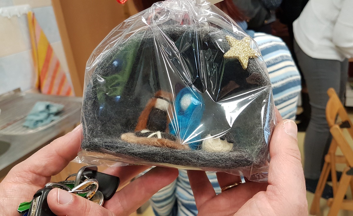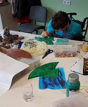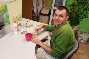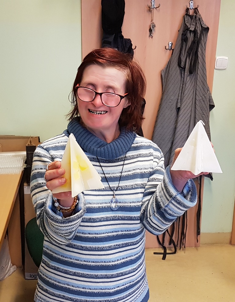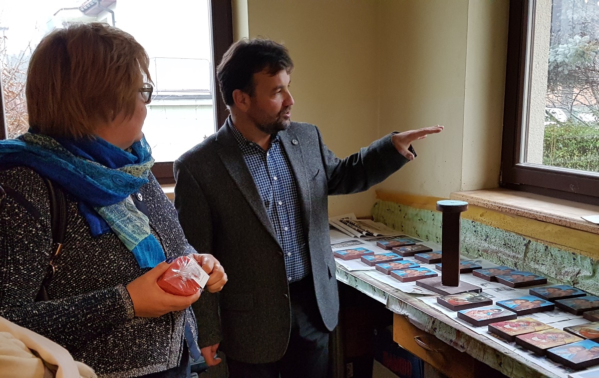 Pani Cecylia – podopieczna Fundacji, po zwiedzaniu mieszkań, oprowadziła Dyrektor Mordarską po Warsztacie Terapii Zajęciowej. W WTZ funkcjonują pracownie produkcji świeczek, stolarska, malarska, gospodarstwa domowego, krawiecka, ceramiczna oraz trening pracy. Wspólnota kładzie duży nacisk na rozwój talentów i budowanie samodzielności, dzięki czemu podopieczni wychodzą na otwarty rynek pracy.