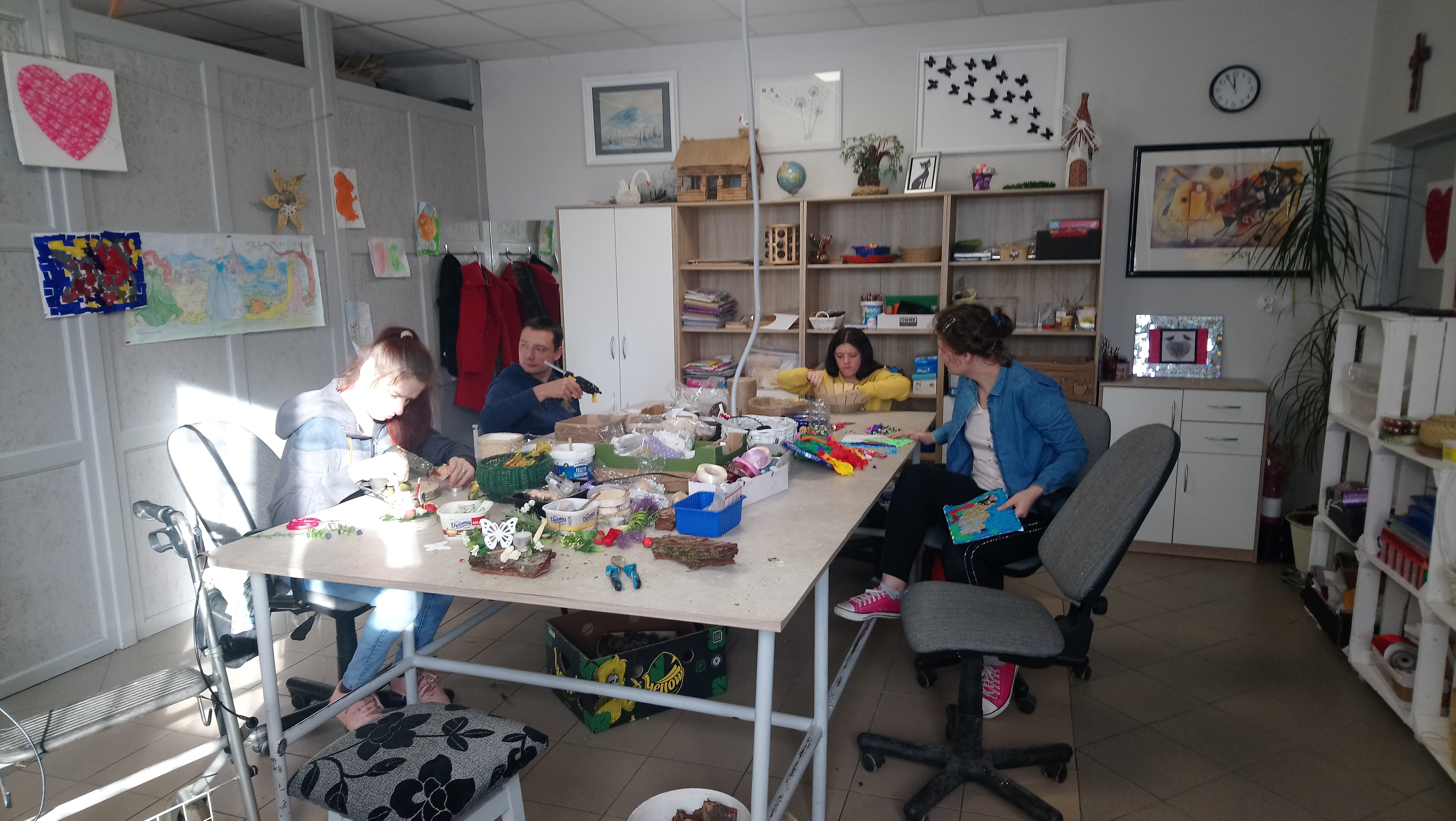 W trakcie naszej wizyty zwiedziliśmy pracownie Warsztatu. Jest ich siedem: pracownia komputerowo-graficzna, krawiecko-zabawkarska, plastyczna, witrażu, stolarsko-wikliniarska, gospodarstwa domowego oraz oczywiście rękodzieła i malarstwa. Każdy więc może znaleźć tutaj coś dla siebie. Pani Elżbieta Śledź kierownik WTZ zaznajomiła nas także z problemami uczestników WTZ, którym w małym środowisku lokalnym trudno znaleźć miejsca do odbycia praktyk i staży.