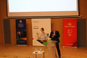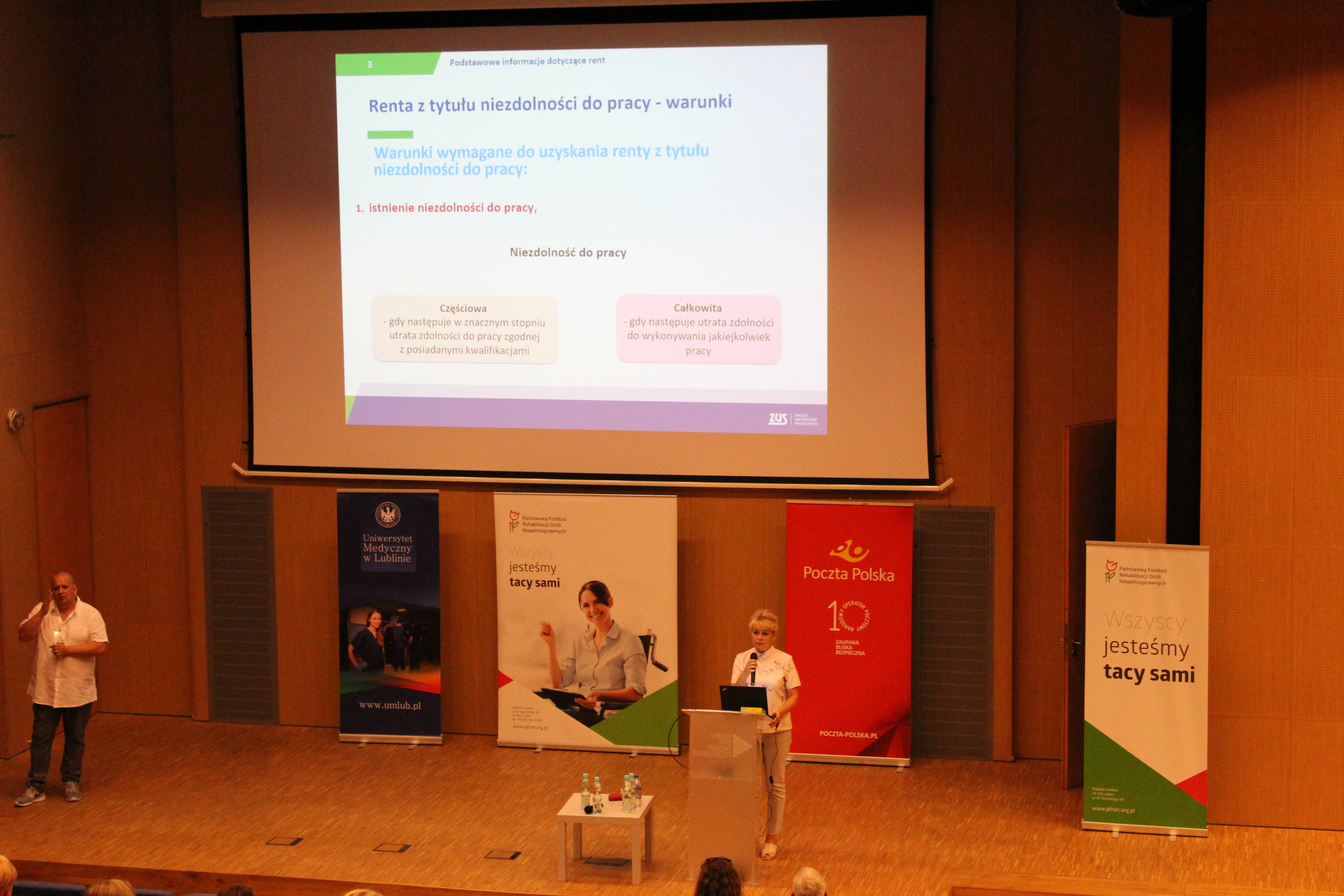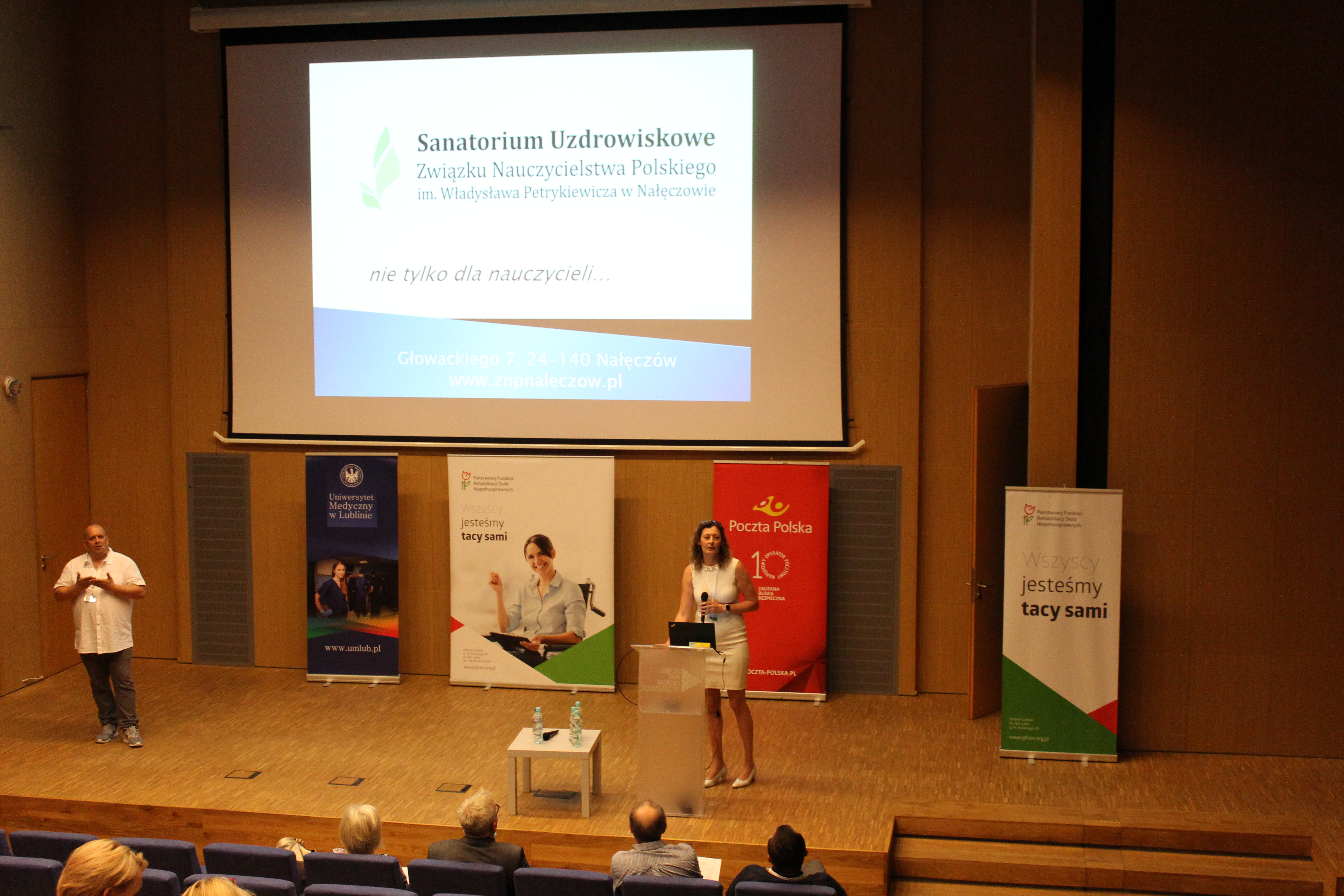 Krystyna Gurbiel Naczelnik Wydziału ds. Projektów Współfinansowanych PFRON zaprezentowała projekty PFRON i ZUS służące budowie modelu kompleksowej rehabilitacji - pilotażowe ośrodki kompleksowej rehabilitacji oraz studia podyplomowe dla specjalistów ds. zarządzania rehabilitacją, natomiast Mirosław Izdebski Dyrektor Departamentu ds. Programów PFRON przedstawił działalność PFRON na rzecz osób z niepełnosprawnościami. W programie konferencji znalazły się również wystąpienia prelegentów Oddziału Lubelskiego ZUS i NFZ, Uniwersytetu Medycznego w Lublinie oraz sanatoriów województwa lubelskiego. Marek Krakowski Dyrektor Regionu Pionu Kapitału Ludzkiego Poczty Polskiej S.A. w Lublinie zaprezentował działalność Poczty Polskiej na rzecz osób z niepełnosprawnościami.