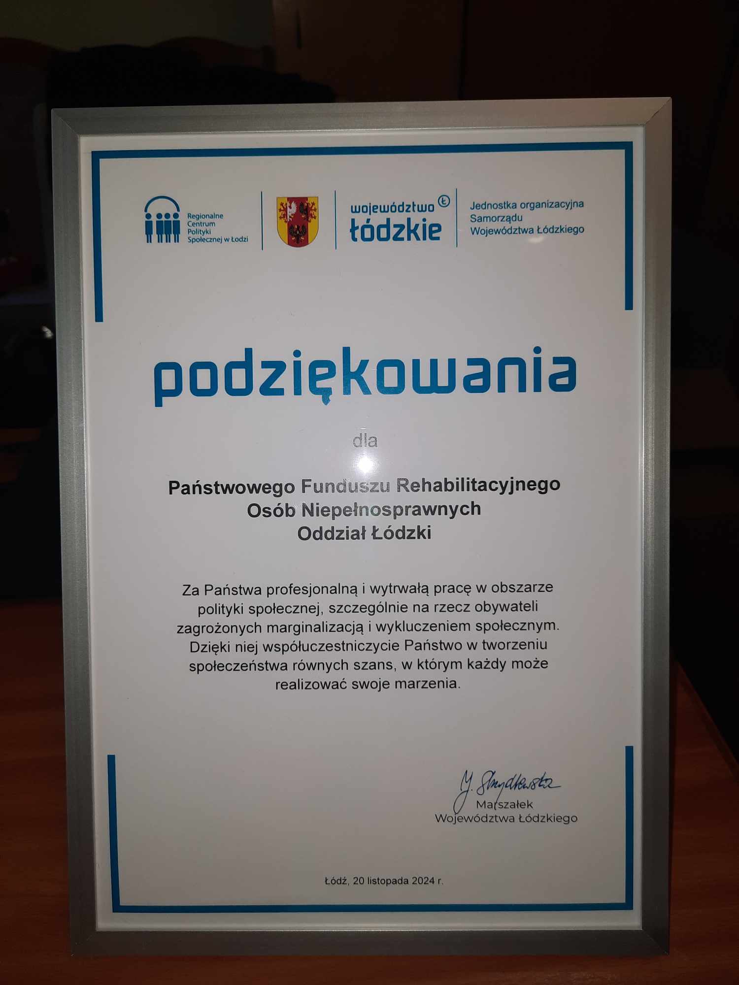 Państwowy Fundusz Rehabilitacji Osób Niepełnosprawnych Oddział Łódzki otrzymał podziękowania za profesjonalną i wytrwałą pracę w obszarze polityki społecznej, szczególnie na rzecz obywateli zagrożonych marginalizacją i wykluczeniem społecznym.