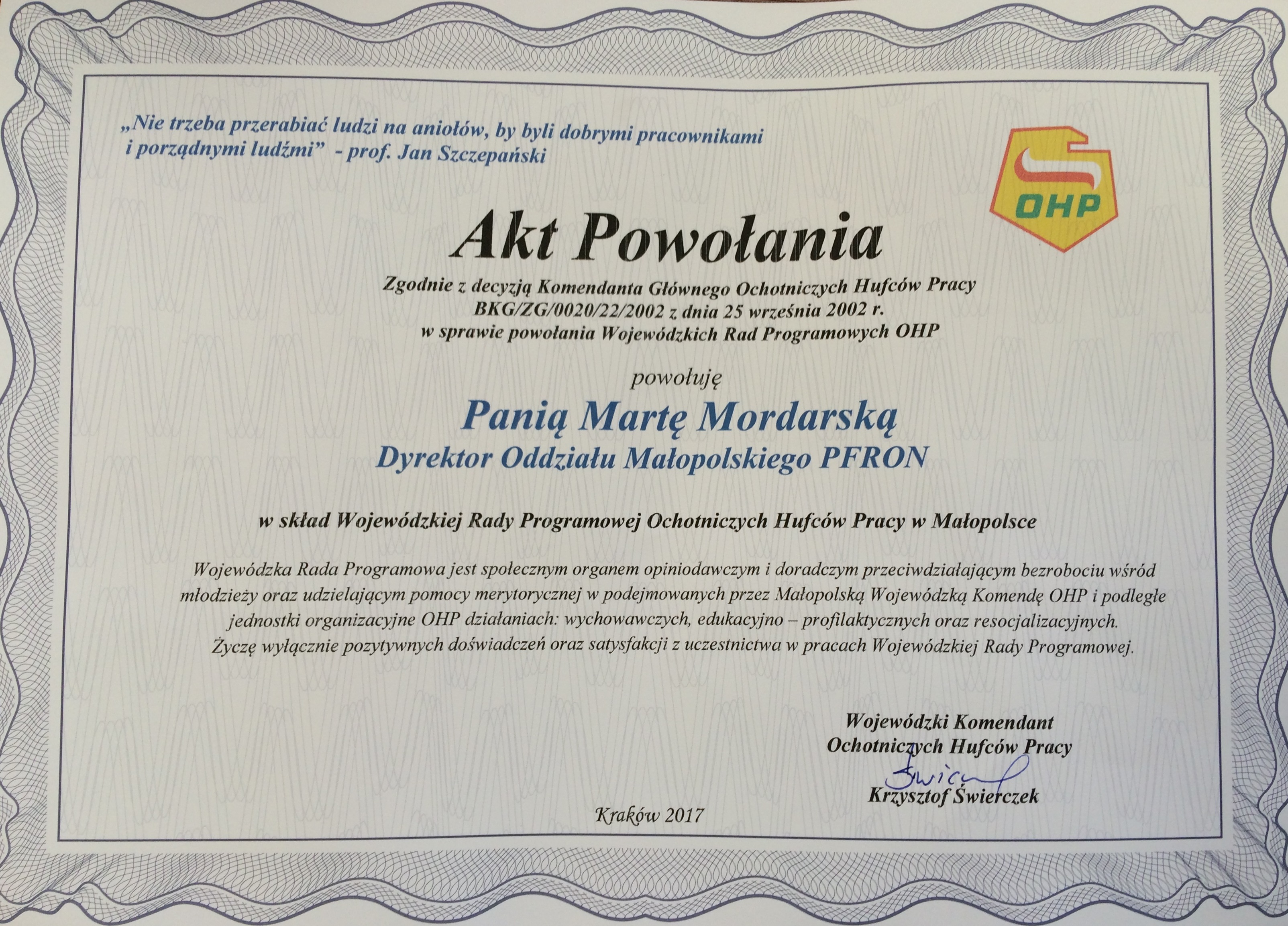 Wypracowanie wspólnych planów działań na rzecz młodzieży zagrożonej wykluczeniem społecznym było jednym z tematów posiedzenia Rady Programowej Małopolskiej Wojewódzkiej Komendy Ochotniczych Hufców Pracy. Marta Mordarska Dyrektor Oddziału Małopolskiego PFRON odebrała na posiedzeniu akt powołania w skład Rady z rąk Marka Surmacza Komendanta Głównego OHP.