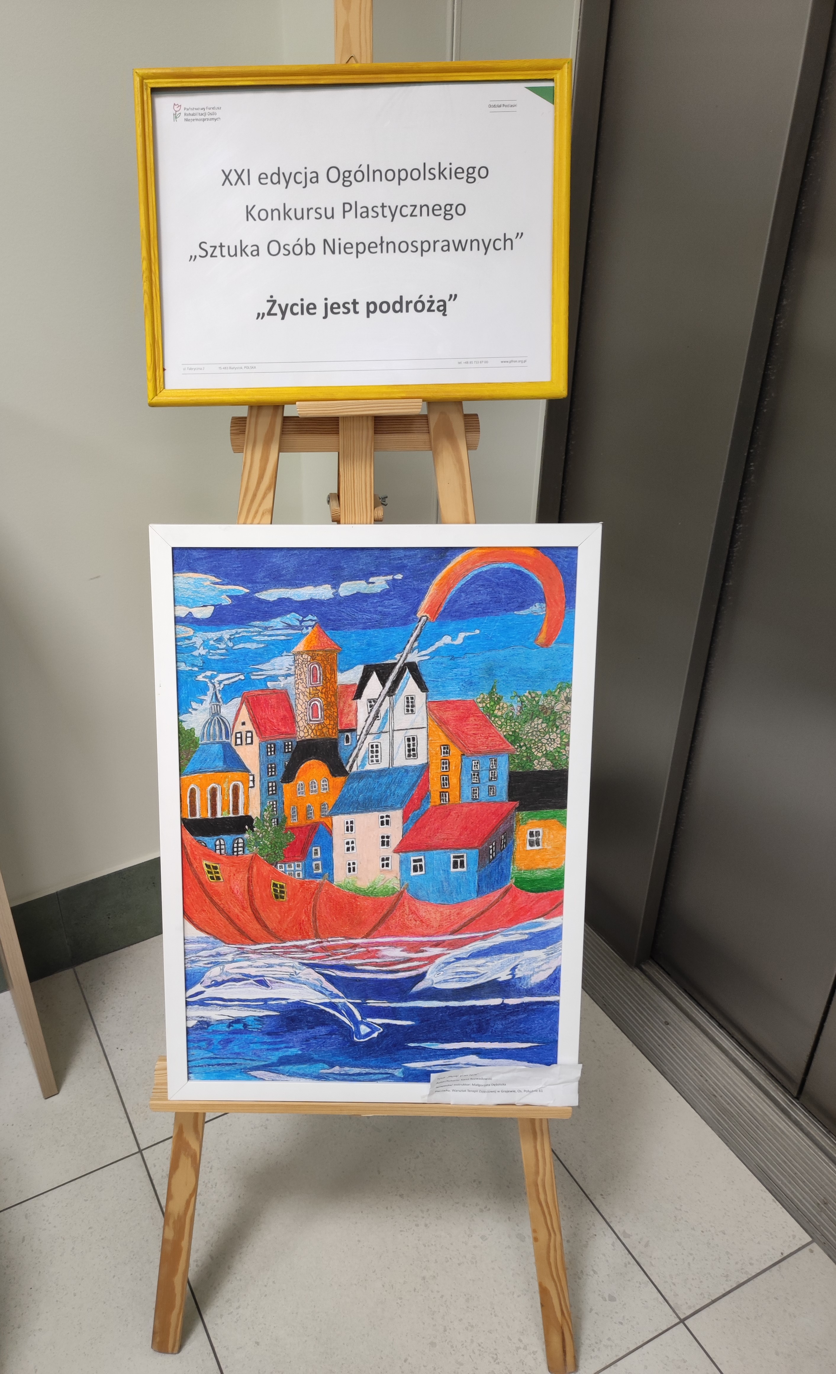 Wystawione prace zostały nagrodzone i wyróżnione w etapie wojewódzkim XXI edycji Ogólnopolskiego Konkursu Plastycznego „Sztuka Osób Niepełnosprawnych”. Pracom towarzyszy temat przewodni pt. „Życie jest podróżą”.