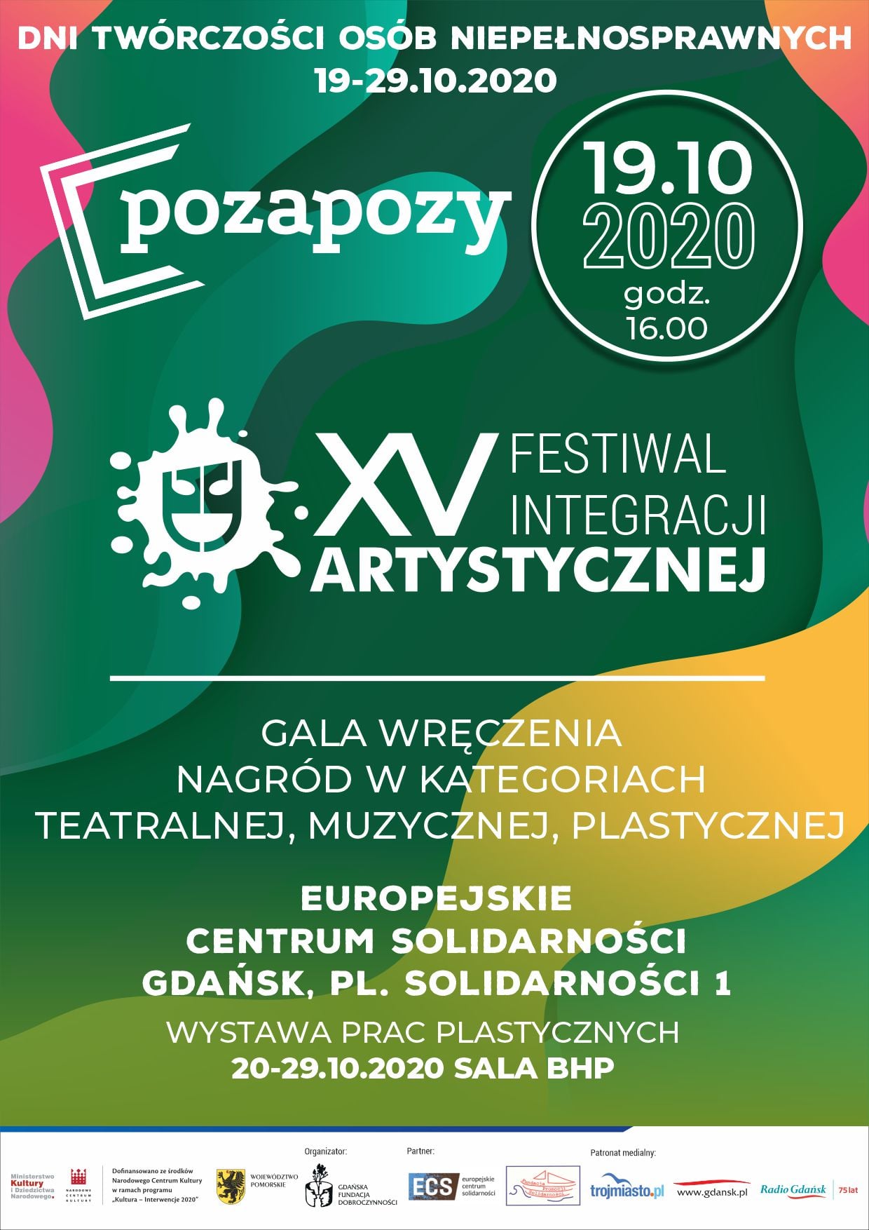 W dniu 19 października 2020 r. o godzinie 16:00 rozpocznie się jubileuszowa XV edycja Festiwalu Integracji Artystycznej „Pozapozy” w Europejskim Centrum Solidarności w Gdańsku. Transmisję tego wydarzenia można będzie oglądać na stronie FB https://www.facebook.com/POZA-POZY-Festiwal-integracji-artystycznej-105303901353871 .