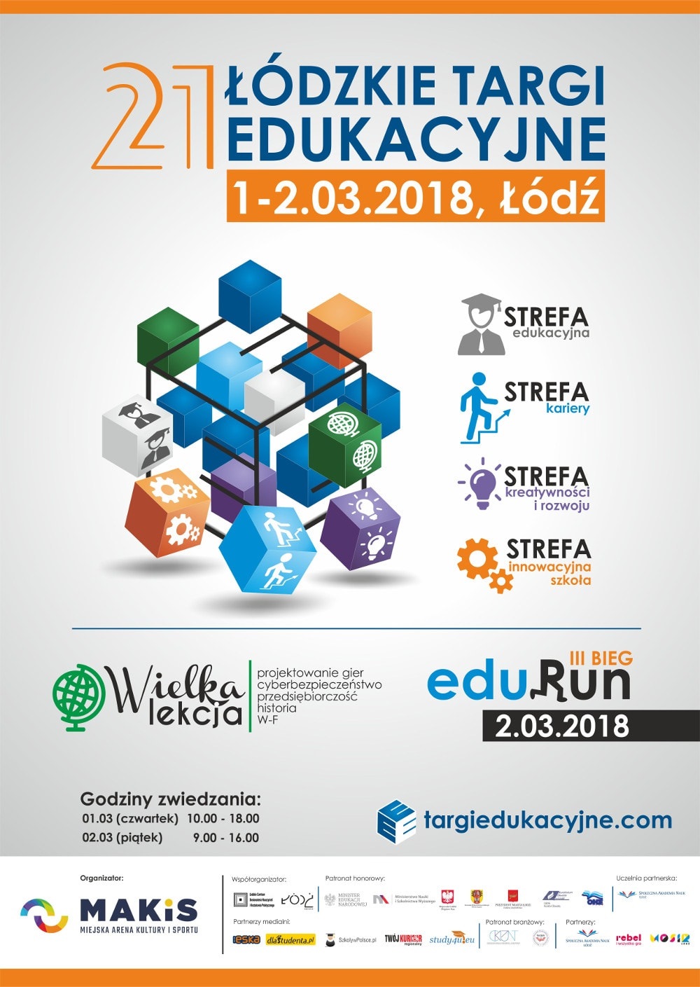 Obecna 21 edycja Łódzkich Targów edukacyjnych to bogata oferta wystawiennicza oraz szereg imprez towarzyszących skierowanych do młodzieży, rodziców oraz kadry pedagogicznej. Podczas tegorocznych Targów nie zabraknie cyklu "Wielkie Lekcje..", biegu eduRun oraz konferencji i seminariów dla kadry pedagogicznej. Uczniowie będą mieli okazję pograć w gry w Strefie Gier oraz podziwiać pokazy na scenie, przygotowane przez wystawców i partnerów.