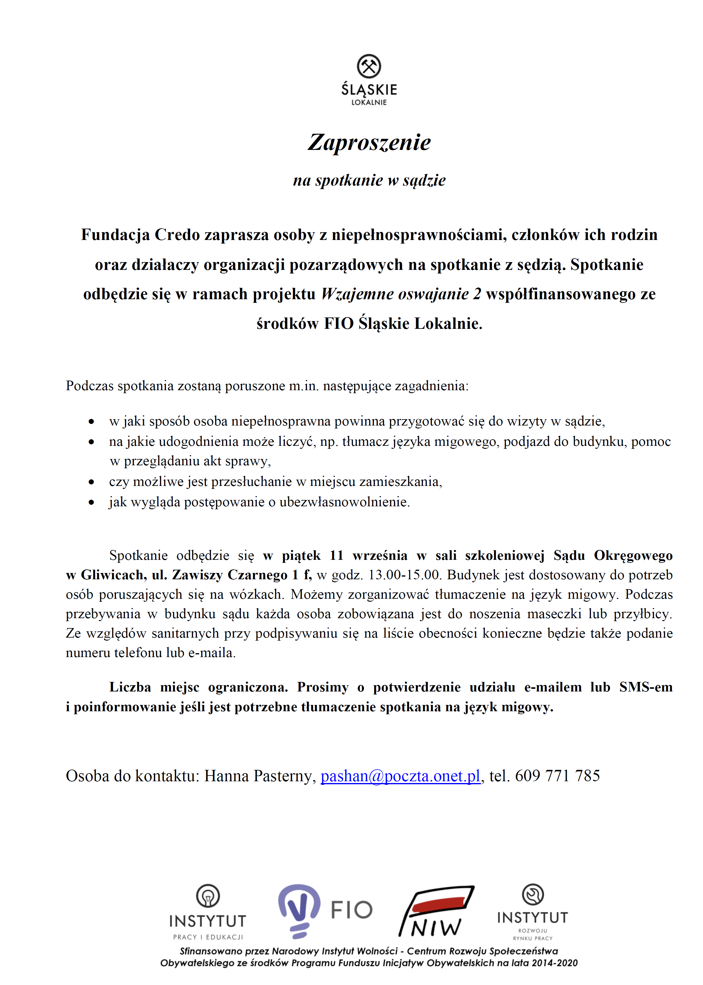Liczba miejsc ograniczona. Osoby zainteresowane proszone są o potwierdzenie udziału e-mailem lub SMS-em i poinformowanie jeśli jest potrzebne tłumaczenie spotkania na język migowy.