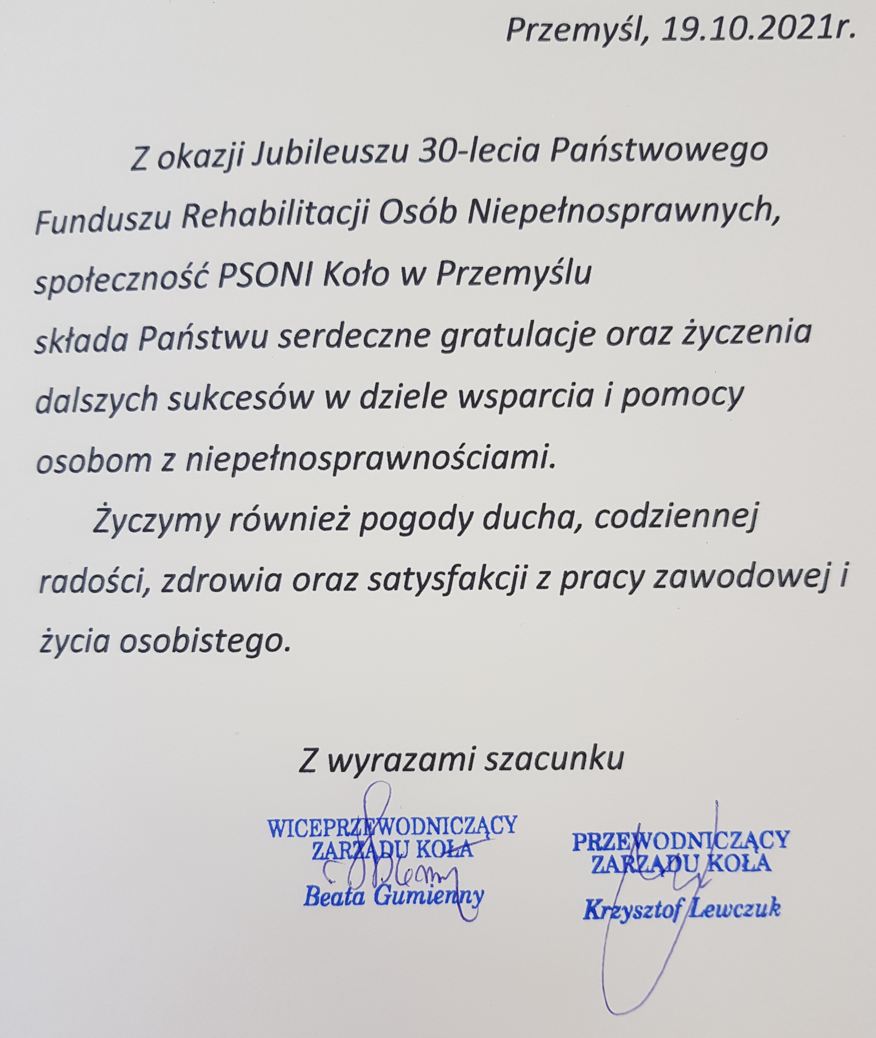 Uczestniczący w tym wydarzeniu Dyrektor Oddziału Podkarpackiego PFRON Maciej Szymański został mile zaskoczony przez Kadrę i Podopiecznych Stowarzyszenia, które pamiętało o jubileuszu 30-lecia naszej działalności.