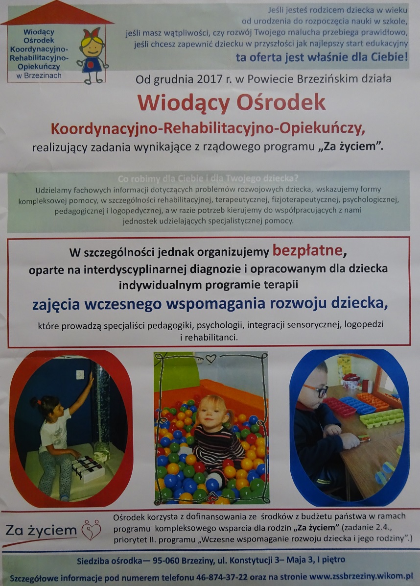 W powiecie brzezińskim działa Wiodący Ośrodek Rehabilitacyjno- Opiekuńczy, realizujący zadania wynikające z rządowego programu „Za życiem”
