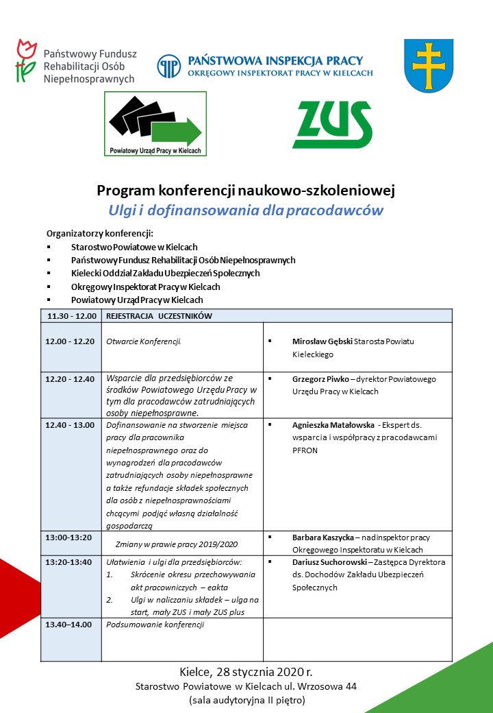 Oddział Świętokrzyski Państwowego Funduszu Rehabilitacji Osób Niepełnosprawnych we współpracy ze Starostwem Powiatowym w Kielcach, Zakładem Ubezpieczeń Społecznych, Państwową Inspekcją Pracy oraz Powiatowym Urzędem Pracy w Kielcach zaprasza na konferencję, pn. „Ulgi i dofinansowania dla pracodawców”.
