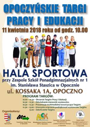 Powiatowy Urząd Pracy w Opocznie wraz ze współorganizatorami: Powiatem Opoczyńskim, Młodzieżowym Centrum Kariery OHP w Opocznie oraz Zespołem Szkół Ponadgimnazjalnych nr 1 im. Stanisława Staszica w Opocznie zapraszają osoby bezrobotne, poszukujące pracy, zainteresowane dalszą nauką i kształceniem do uczestnictwa w Targach i zapoznania się z możliwościami podjęcia pracy i edukacji.