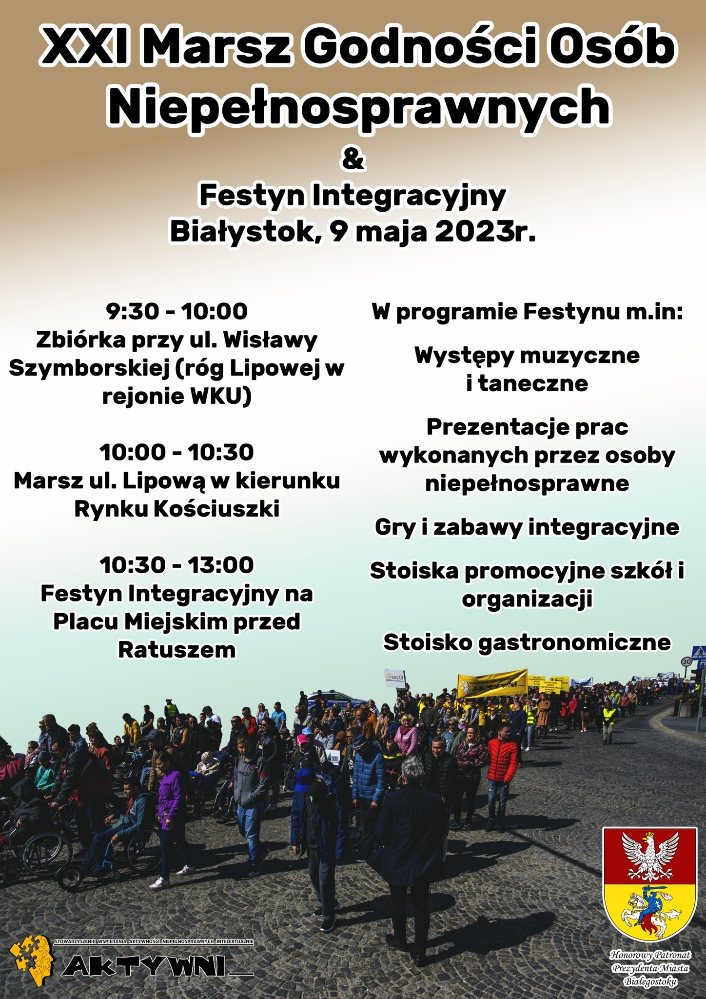 9 maja 2023 roku po raz dwudziesty pierwszy w Białymstoku, odbędzie się Marsz Godności Osób Niepełnosprawnych oraz Festyn Integracyjny. Organizatorem imprezy jest Stowarzyszenie Wspierania Aktywności Niepełnosprawnych Intelektualnie „Aktywni”.