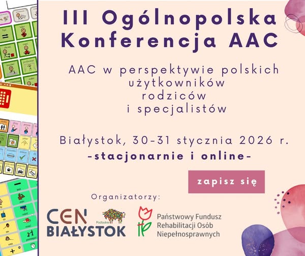 Zapraszamy do udziału w III Ogólnopolskiej Konferencji AAC, która odbędzie się w dniach 30–31 stycznia 2026 r. w Białymstoku oraz online.
