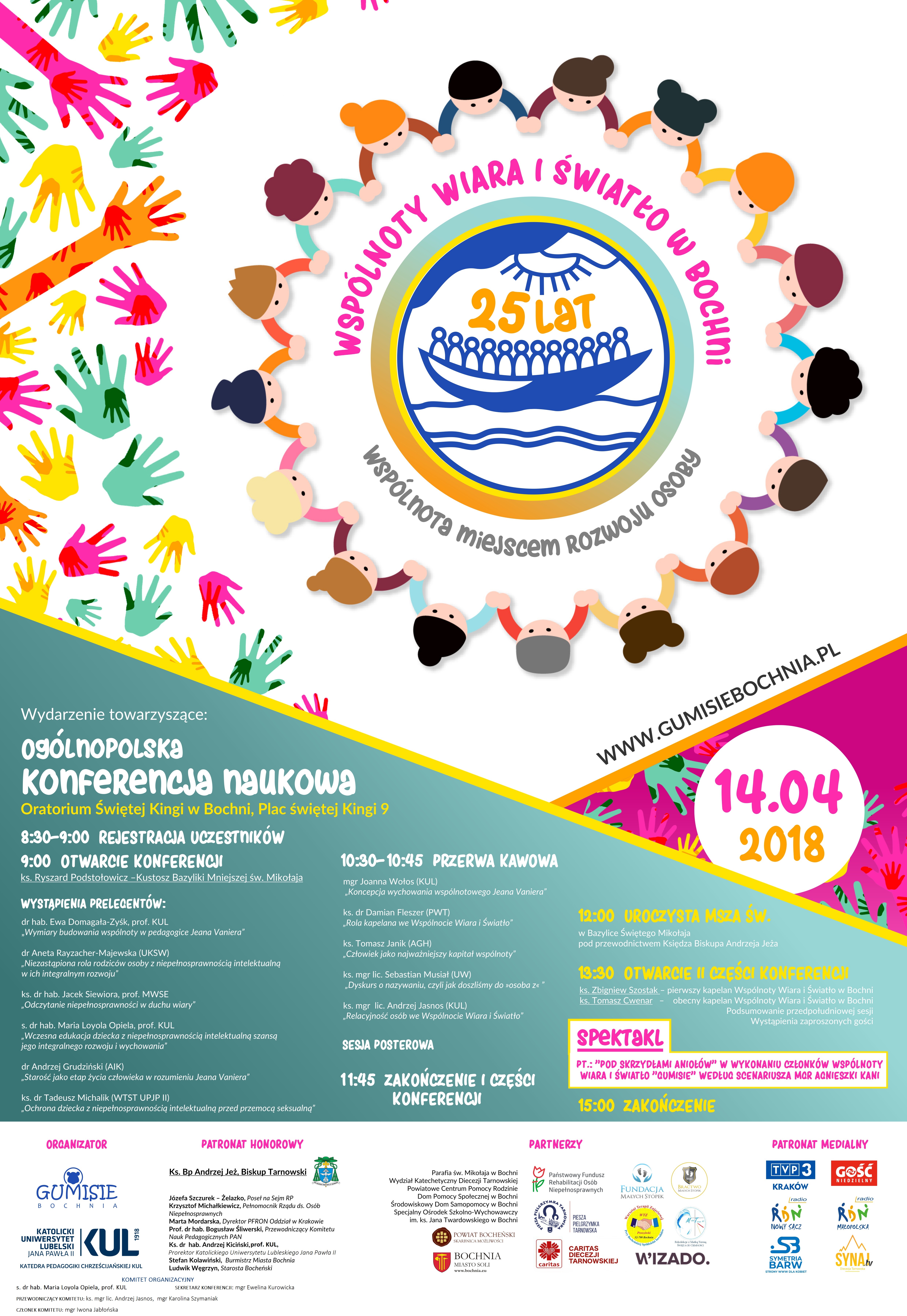 W związku z 25 jubileuszem WSPÓLNOTY WIARA I ŚWIATŁO Małopolski Oddział PFRON zaprasza na Ogólnopolską Konferencją Naukową pt. WSPÓLNOTA MIEJSCEM ROZWOJU OSOBY. Organizatorem wydarzenia, które odbędzie się w dniu 14 kwietnia b.r. jest Katedra Pedagogiki Chrześcijańskiej KUL, a jednym z partnerów Państwowy Fundusz Rehabilitacji Osób Niepełnosprawnych.