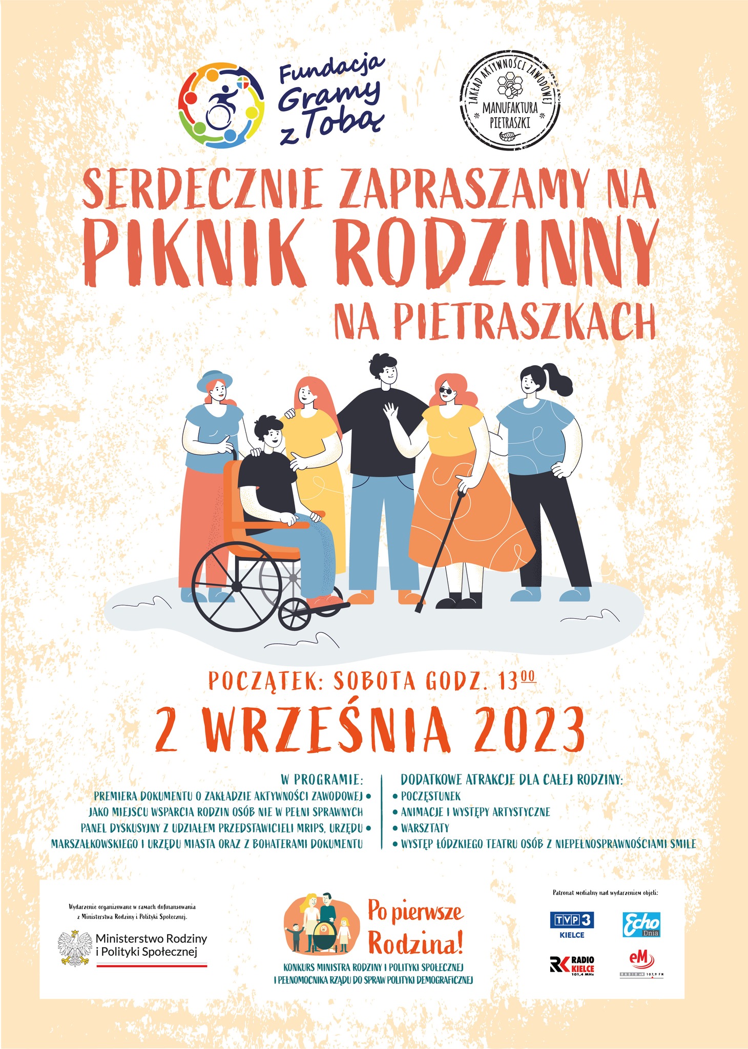 Fundacja Gramy z Tobą i Manufaktura Pietraszki - Zakład Aktywności Zawodowej zapraszają na Piknik Rodzinny który odbędzie się 2 września br. na terenie Manufaktury przy ulicy Pietraszki 15 w Kielcach. Początek festynu planowany jest na 13.00. Piknik odbędzie się w ramach projektu „Po Pierwsze Rodzina!” dofinansowanego w konkursie Ministerstwa Rodziny i Polityki Społecznej. Podczas spotkania zaprezentowany będzie dokument o ZAZ i jego pracownikach. Odbędzie się także rozmowa z gośćmi i bohaterami dokumentu o tym, w jaki sposób zakład aktywności zawodowej, jako podmiot ekonomii społecznej, wspiera rodzinę. Przewidziano liczne atrakcje: poczęstunek, animacje i występy artystyczne, warsztaty oraz spektakl Teatr Smile - Łódzki Teatr Osób z Niepełnosprawnością. Wstęp wolny organizatorzy serdecznie zapraszają.
