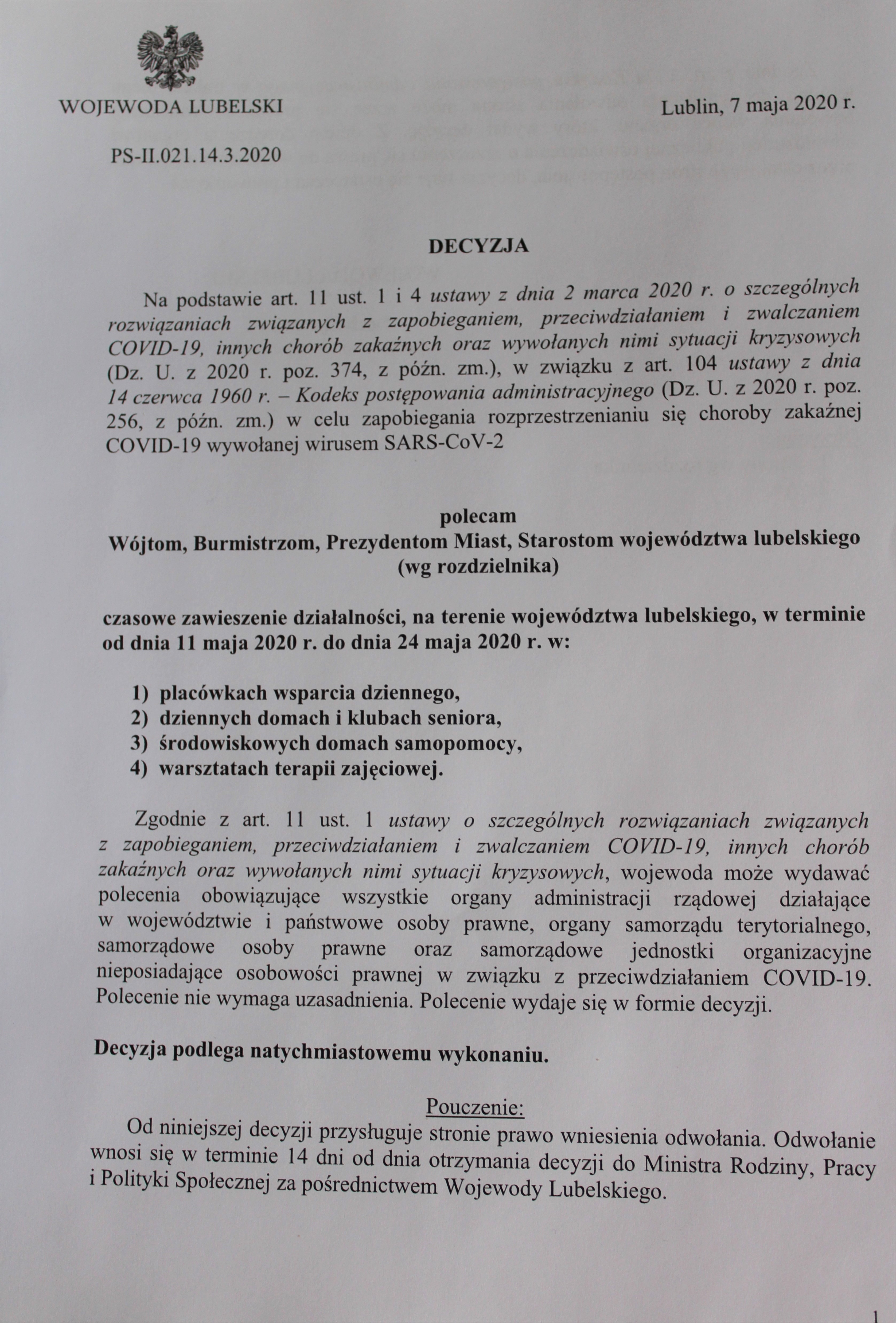 Od niniejszej decyzji przysługuje stronie prawo wniesienia odwołania. Odwołanie wnosi się w terminie 14 dni od dnia otrzymania decyzji do Ministra Rodziny, Pracy i Polityki Społecznej za pośrednictwem Wojewody Lubelskiego.