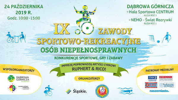 Konkurencje sportowe, gry i zabawy oraz liczne atrakcje zaplanowane są podczas „Śląskich Zawodów Sportowo-Rekreacyjnych Osób Niepełnosprawnych”. Zawody odbędą się 24 października 2019 r. w godz. od 10.00 do 15.00 w hali widowiskowo-sportowej CENTRUM Ośrodka Sportu i Rekreacji oraz na sąsiadującym z nią NEMO – Świat Rozrywki w Dąbrowie Górniczej.