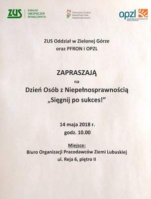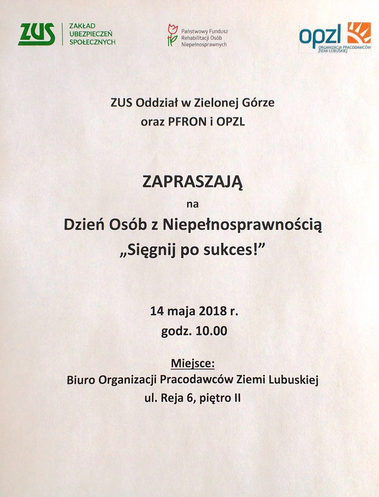 14 maja (poniedziałek) o godz. 10.00 w siedzibie Organizacji Pracodawców Ziemi Lubuskiej przy ul. Reja 6 w Zielonej Górze odbędzie się „Dzień Osób z Niepełnosprawnością – Sięgnij po sukces!”.