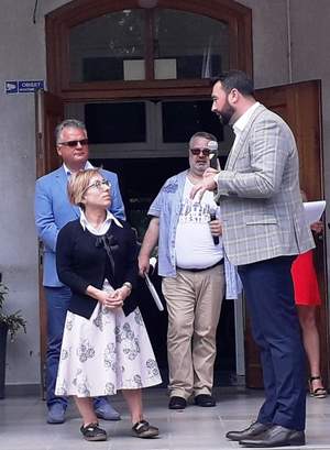 Starosta powiatu płockiego rozmawia z Dyrektorem Oddziału Mazowieckiego za nimi stoi wójt Bodzanowa wraz z prowadzącym olimpiadę
