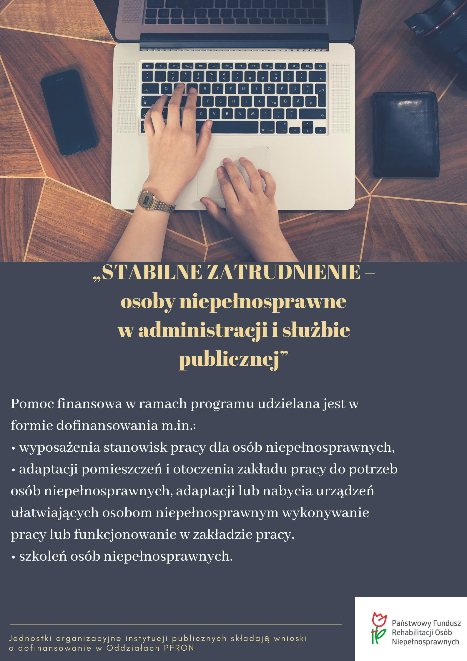 Oddział Śląski Państwowego Funduszu Rehabilitacji Osób Niepełnosprawnych w Katowicach celem zwiększenia zatrudnienia osób niepełnosprawnych w administracji publicznej, ponownie rozpoczyna promocję programu „Stabilne Zatrudnienie – osoby niepełnosprawne w administracji i służbie publicznej”.