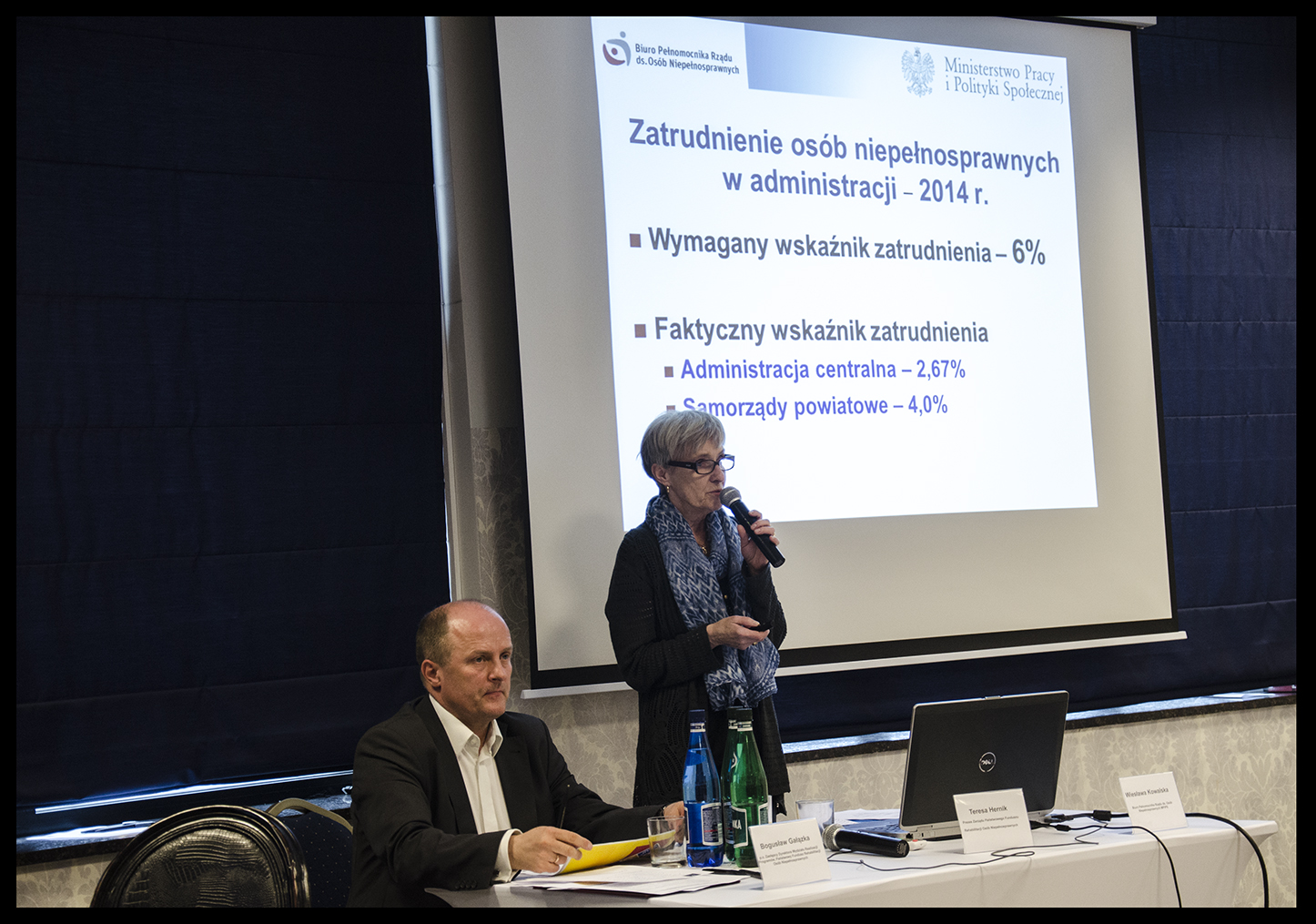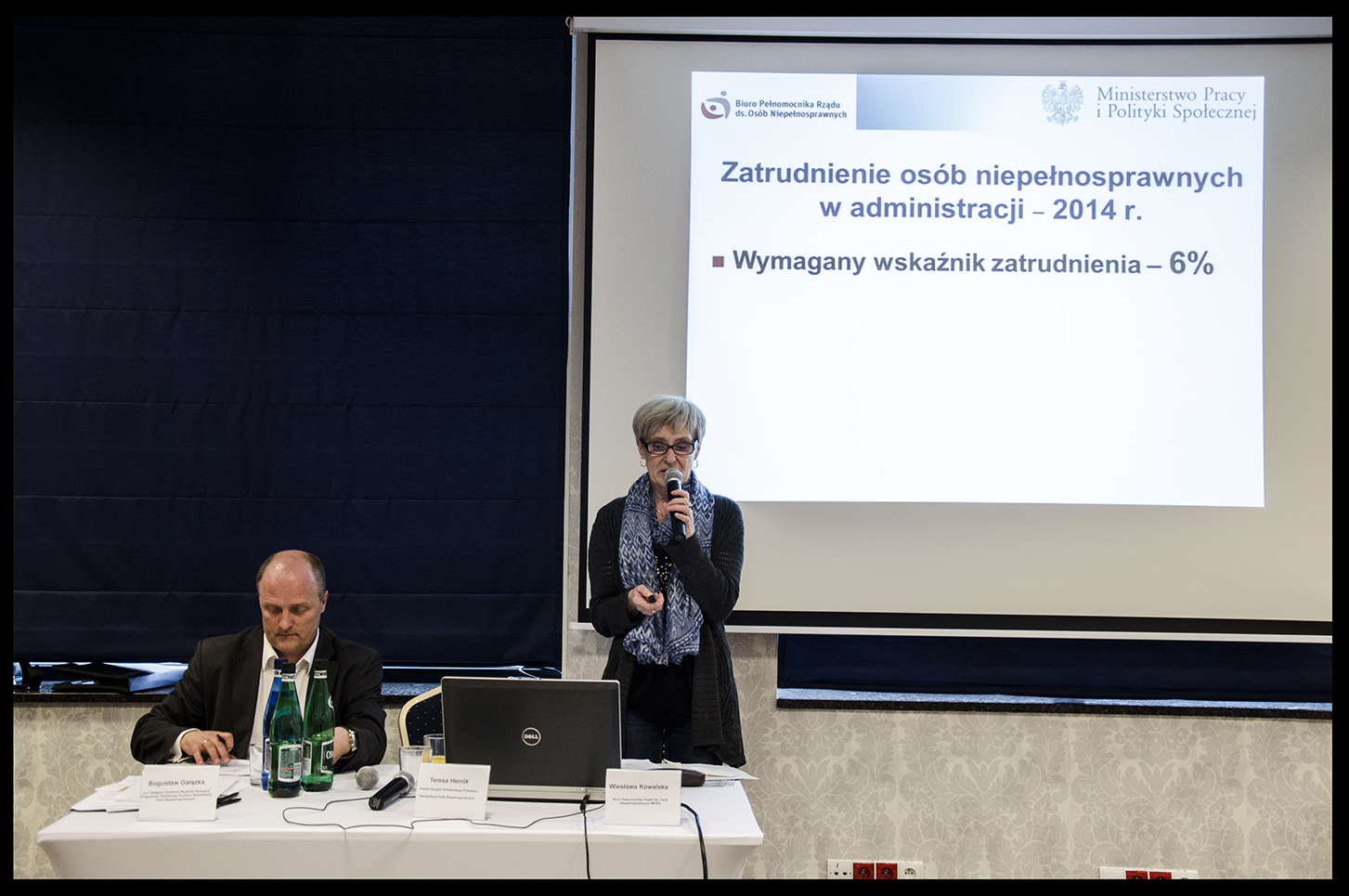 Po przerwie kawowej Pani Wiesława Kowalska z Biura Pełnomocnika Rządu ds.Osób Niepełnosprawnych Ministerstwa Pracy i Polityki Społecznej przedstawiła bieżące statystyki dotyczące zatrudnienia osób niepełnosprawnych w administracji publicznej. Wskazywała na czynniki utrudniające zatrudnienie osób zniepełnosprawnościami, takie jak np.: niedostosowana infrastruktura budynków, nieodpowiednie kwalifikacje ON, koszty finansowe i organizacyjne dostosowania stanowiska pracy, a także: bierność osób niepełnosprawnych, nieodpowiednie, niewystarczające kwalifikacje, brak doświadczenia zawodowego oraz niska samoocena, brak motywacji itp. W drugiej części wystąpienia, Pani Wiesława Kowalska przede wszystkim wskazywała napotencjał drzemiący w osobach zniepełnosprawnością, przytaczała wskazówki jak ówpotencjał wykorzystać.