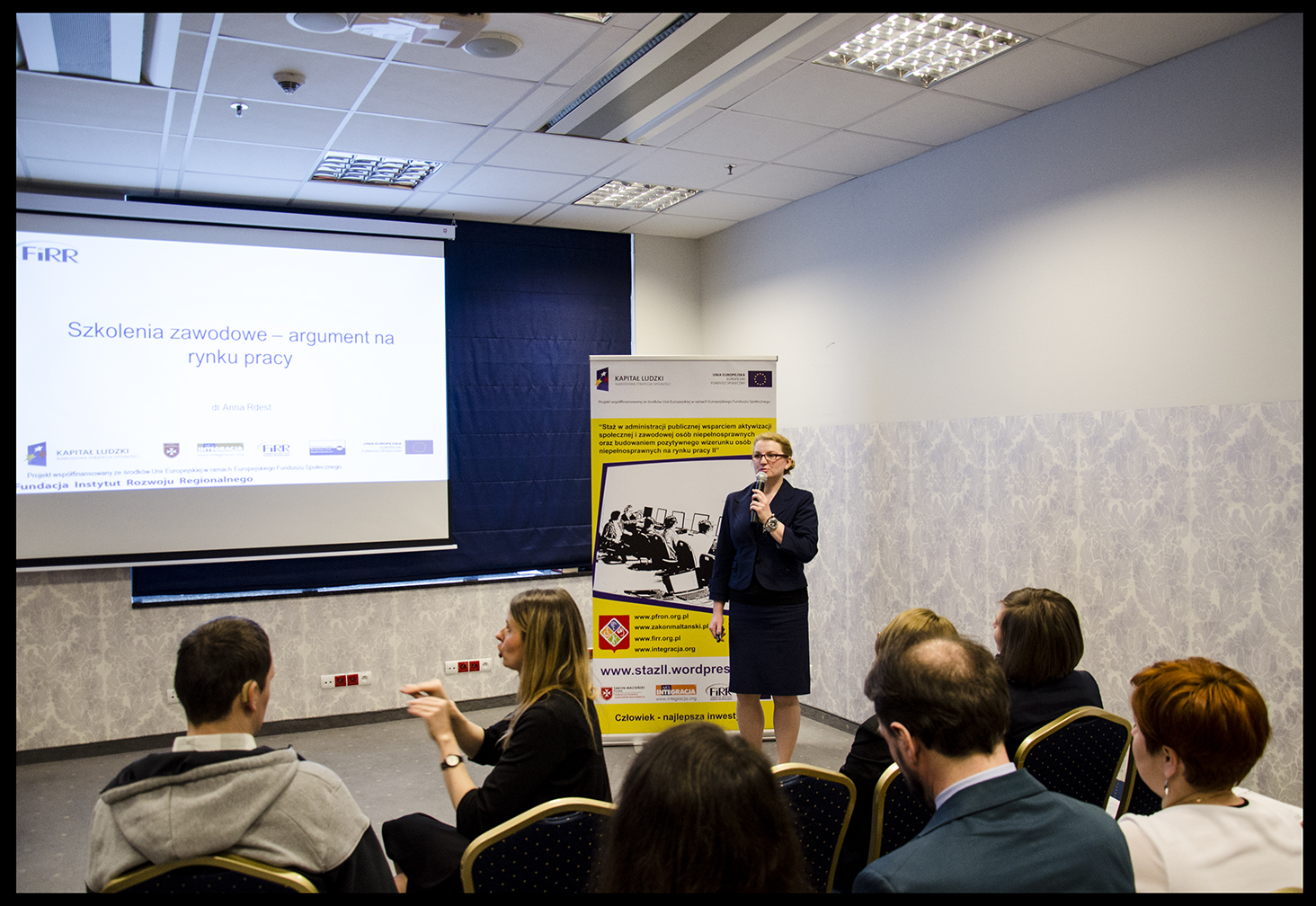 Kolejnym punktem programu było wystąpienie Pani dr Anny Rdest zFundacji Instytut Rozwoju Regionalnego pt. Szkolenia zawodowe - argument na rynku pracy. W swoim wystąpieniu dr Anna Rdest mówiła o istotnej roli szkoleń zawodowych, które znacząco podnoszą kwalifikacje BO oraz pośrednio przyczyniają się dozdobycia wymarzonej pracy. W trakcie realizacji projektu 120 Beneficjentów wzięło udział w 167 szkoleniach i kursach zawodowych podnoszących kwalifikacje. Wtrakcie prezentacji przytoczono wypowiedzi Uczestników projektu, poniżej cytujemy jedną z nich: