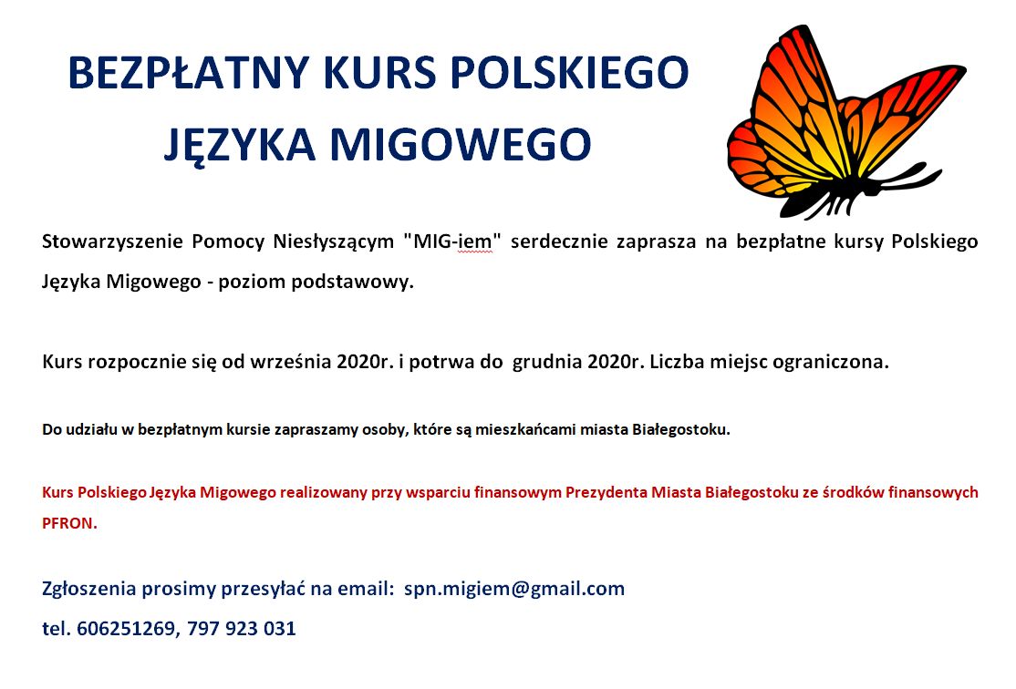 Oddział Podlaski PFRON informuje, że Stowarzyszenie Pomocy Niesłyszącym "MIG-iem" organizuje bezpłatny kurs Polskiego Języka Migowego na poziomie podstawowym (pierwszy stopień).