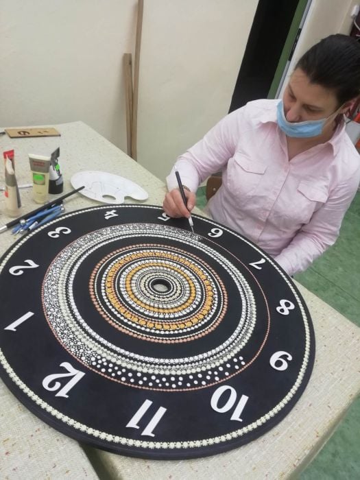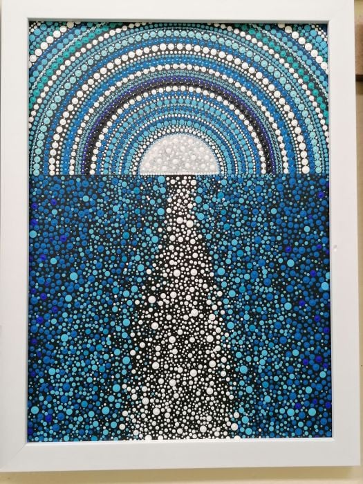Praca z kropkami została wprowadzona niedawno w pracowni plastycznej WTZ, polega na tworzeniu pięknych kompozycji za pomocą małych kropek. Początek pracy to zaplanowanie wyglądu, wyznaczenie obszaru do malowania, a następnie ołówkiem utworzenie szkicu aby za pomocą pędzla go wykropkować. Stworzenie pięknego i harmonijnego obrazu wymaga wielu godzin skupienia i dokładności.