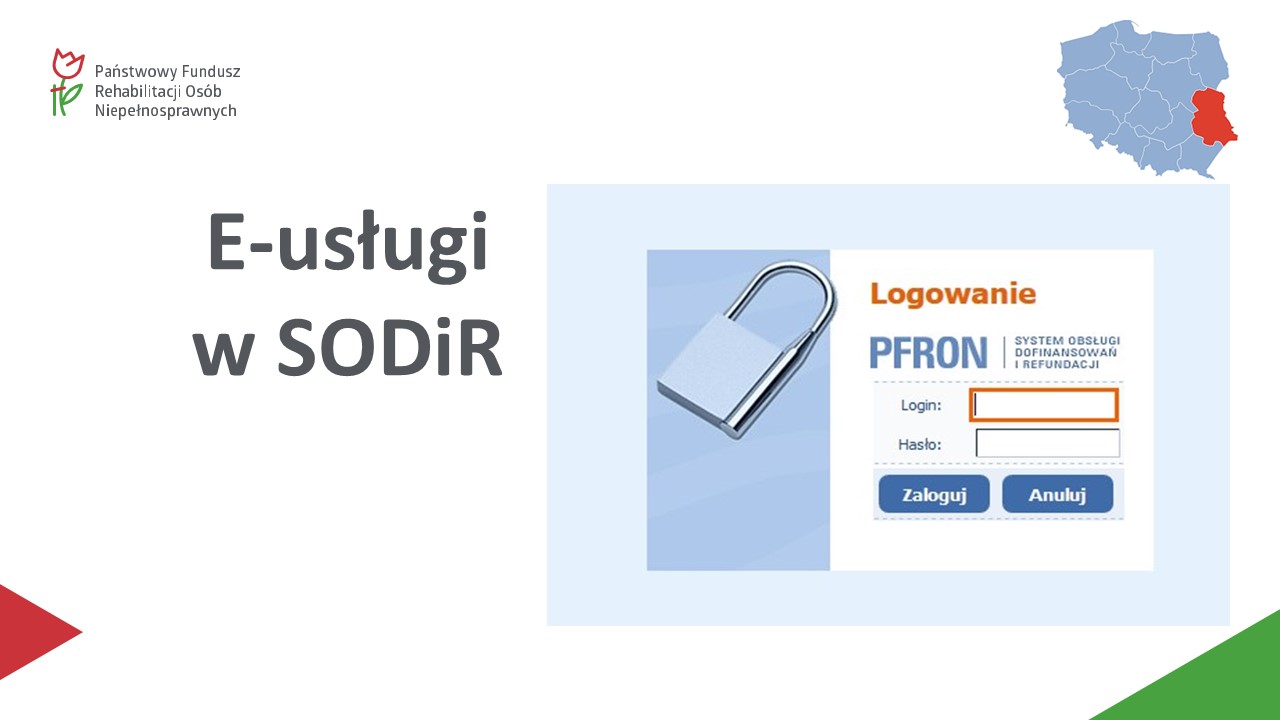 Jeśli nie posiadają Państwo loginu i hasła do Systemu SODiR, prosimy o przesłanie na adres e-mail: lublin@pfron.org.pl wniosku o nadanie loginu i hasła, który powinien zawierać następujące dane: pełną nazwę beneficjenta, adres, NIP, REGON oraz nr PFRON.