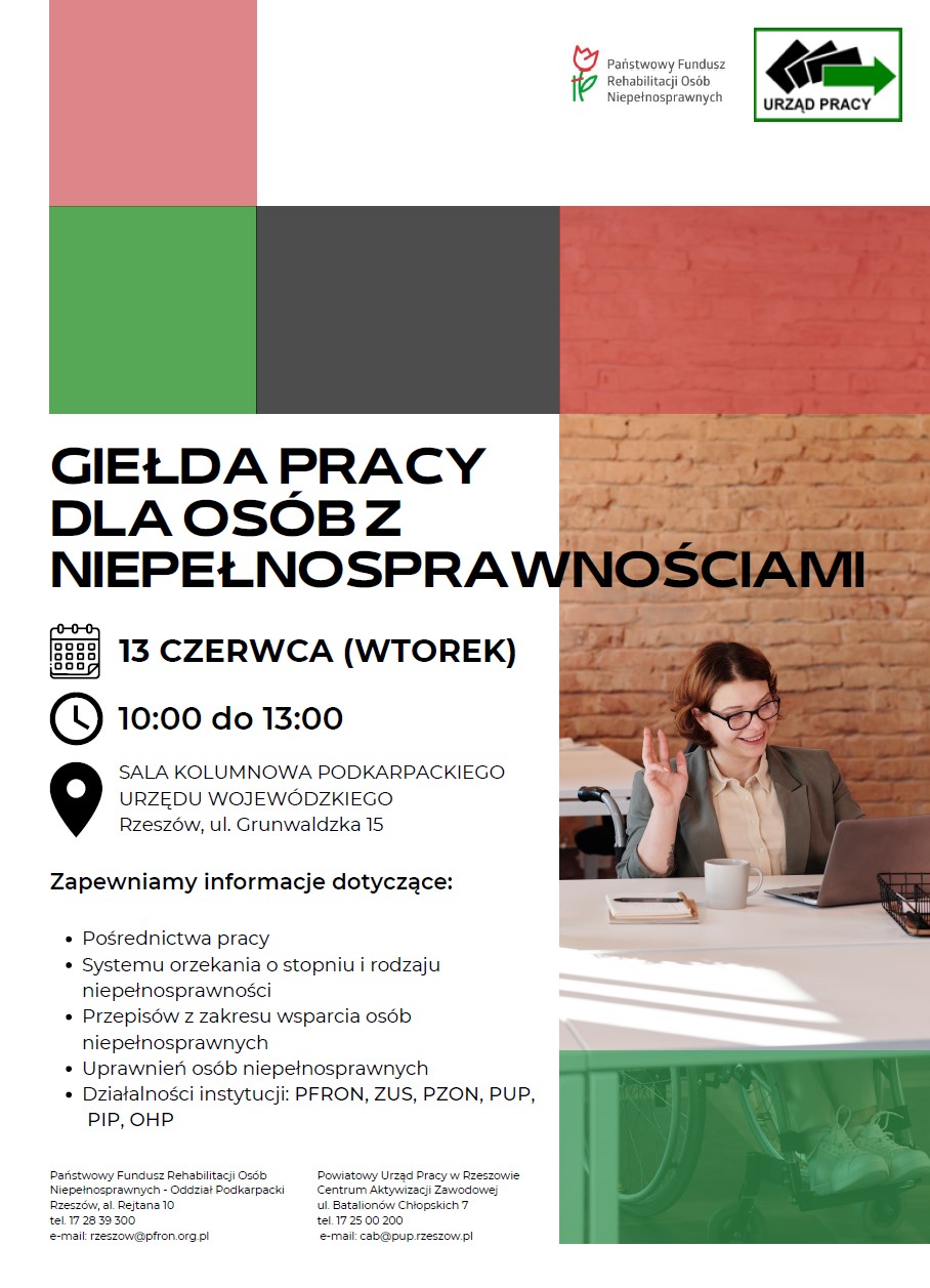 Zapraszamy osoby z niepełnosprawnościami poszukujące zatrudnienia do udziału w Giełdzie Pracy, która odbędzie się 13 czerwca 2023 roku (wtorek) w Sali Kolumnowej Podkarpackiego Urzędu Wojewódzkiego w Rzeszowie, ul. Grunwaldzka 15, w godzinach od 10.00 do 13.00.