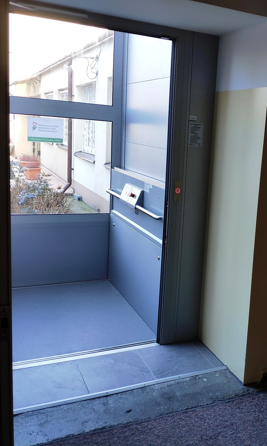 Inwestycja polegała na instalacji zewnętrznego podnośnika dla osób niepełnosprawnych przy dwukondygnacyjnym budynku oświatowym.