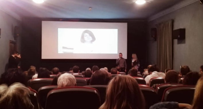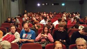 Sala niebieska Kina Pod Baranami. Wszystkie miejsca zajęte. W fotelach siedzą osoby dorosłe: kobiety i mężczyźni. Wszyscy mają w uszach słuchawki, a na telefonach uruchomioną aplikację AudioMovie. Część osób wpatrzona jest w ekran. Na ekranie pojawia się pierwsza scena filmu „Zimna Wojna”. Film jest czarno – biały, prawie kwadratowy kadr.