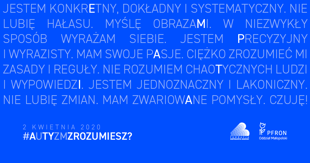 2 kwietnia świętowaliśmy Światowy Dzień Świadomości Autyzmu. Z tej okazji z inicjatywy Oddziału Małopolskiego Państwowego Funduszu Rehabilitacji Osób Niepełnosprawnych oraz Fundacji Wspólnota Nadziei – Farma Życia powstała kampania promująca otwartość, empatię i zrozumienie dla odmiennych potrzeb i możliwości osób ze spektrum autyzmu.