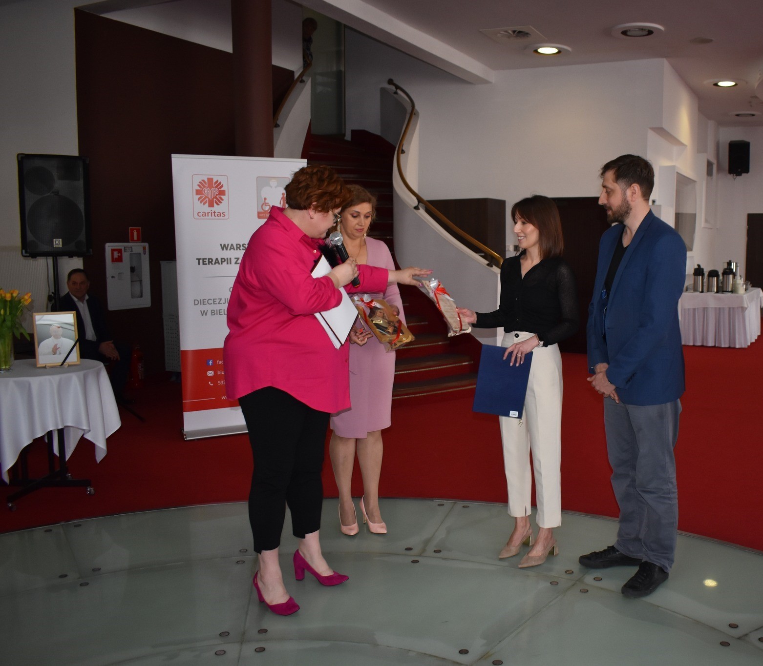 Nie zabrakło również chwili wdzięczności – wręczono podziękowania oraz symboliczne upominki osobom, które w szczególny sposób przyczyniły się do realizacji tego przedsięwzięcia. W gronie wyróżnionych znalazła się m.in. Urszula Kierznowska – wz. Dyrektora Podlaskiego Oddziału PFRON.
