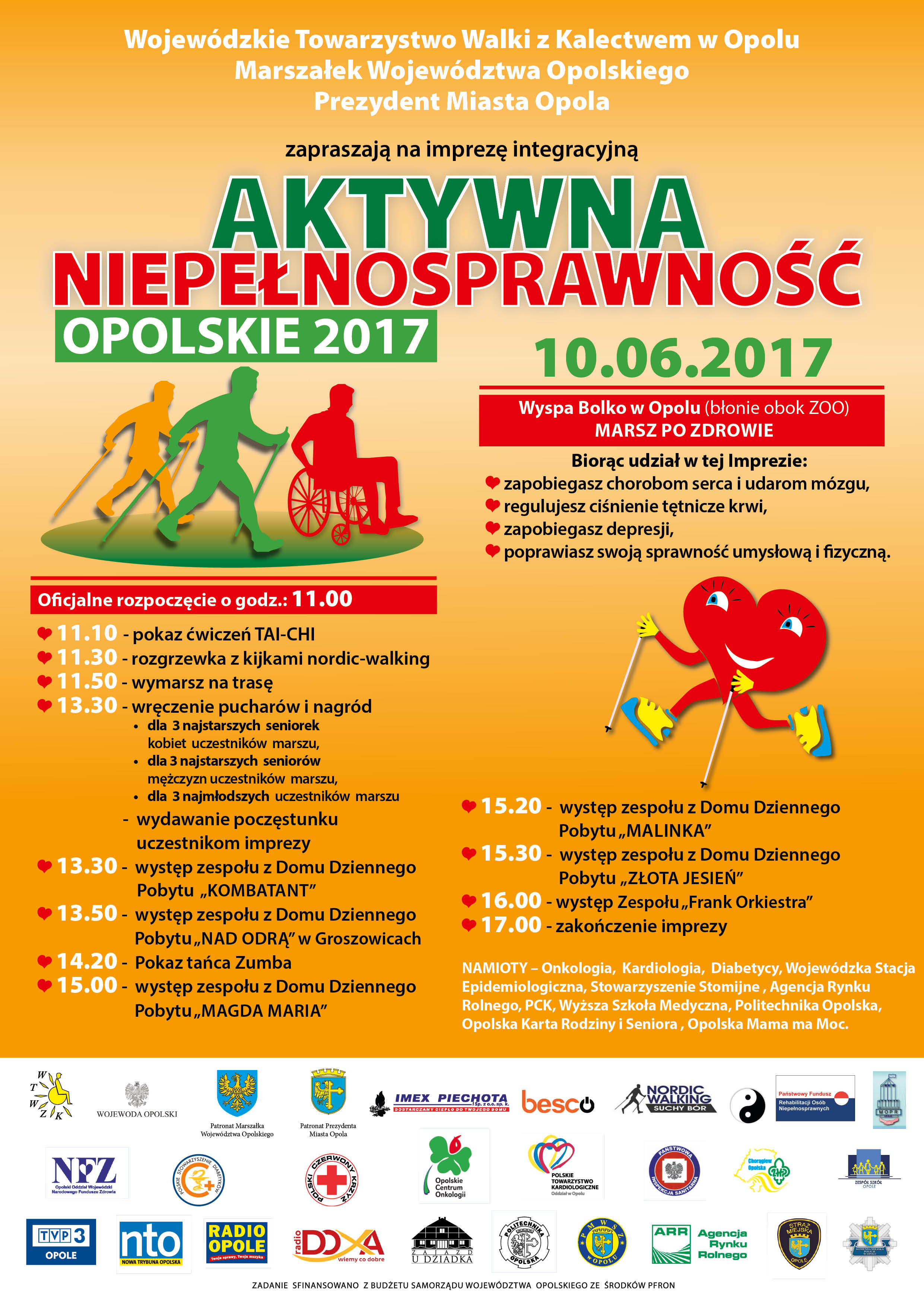 10 czerwca zapraszamy do wzięcia udziału w imprezie AKTYWNA NIEPEŁNOSPRAWNOŚĆ – Opolskie 2017, która odbędzie się w Opolu na wyspie Bolko. Oficjalne o godzinie 11 imprezę otworzą Marszałek Województwo Opolskiego i Prezydent Miasta Opola. Przed godz. 12 spod bramy Opolskiego ZOO wyruszy marsz. Uczestnicy będą mieli do przebycia trasę o długości 4,5 km, która biegnie ścieżkami Parku na Wyspie Bolko. 12 osób spośród wszystkich biorących udział w marszu zostanie nagrodzonych w 4 kategoriach (3 panie w grupie seniorek, 3 panowie w grupie seniorów, 3 najmłodszych uczestników oraz 3 osoby na wózkach inwalidzkich).