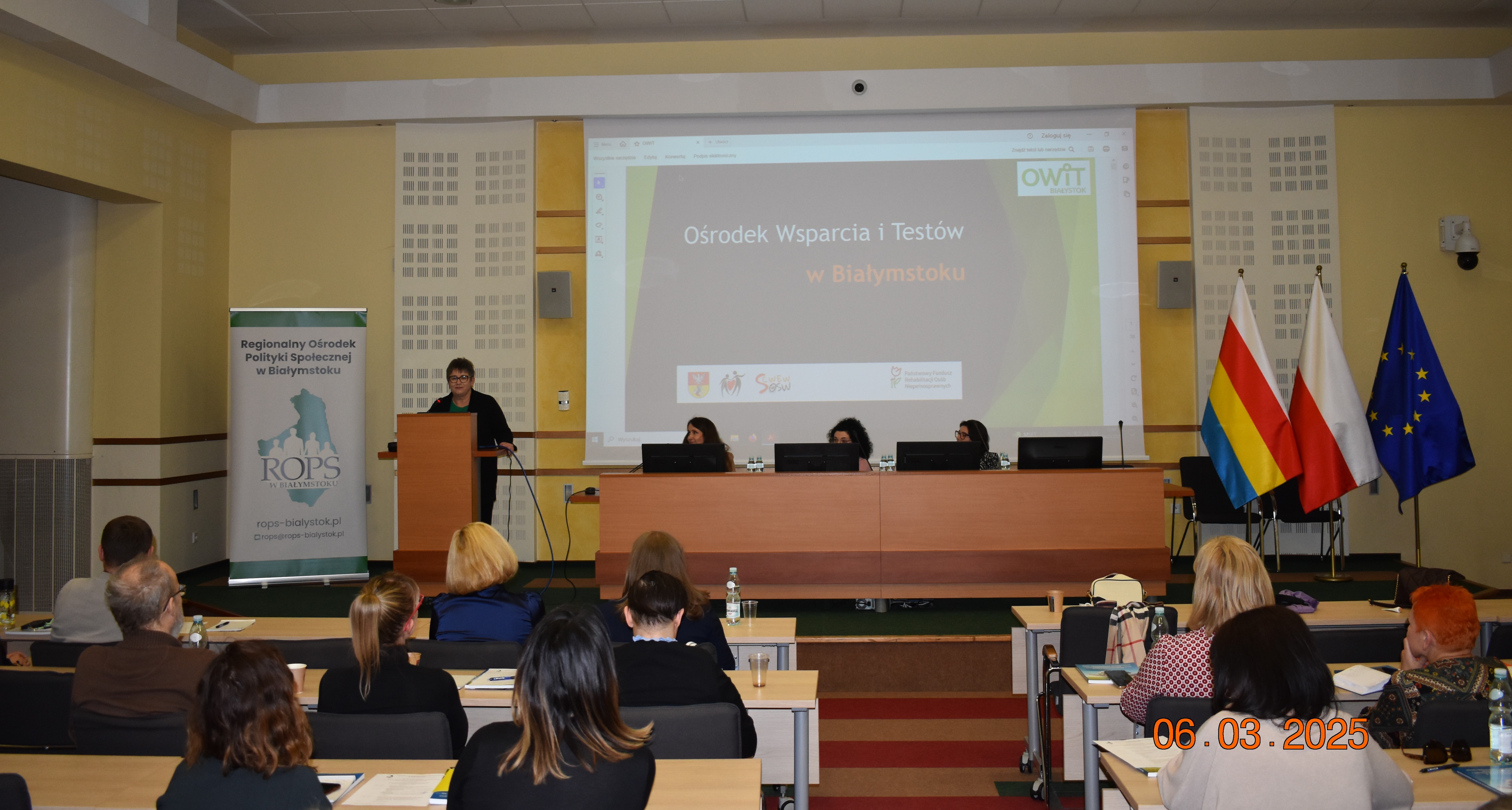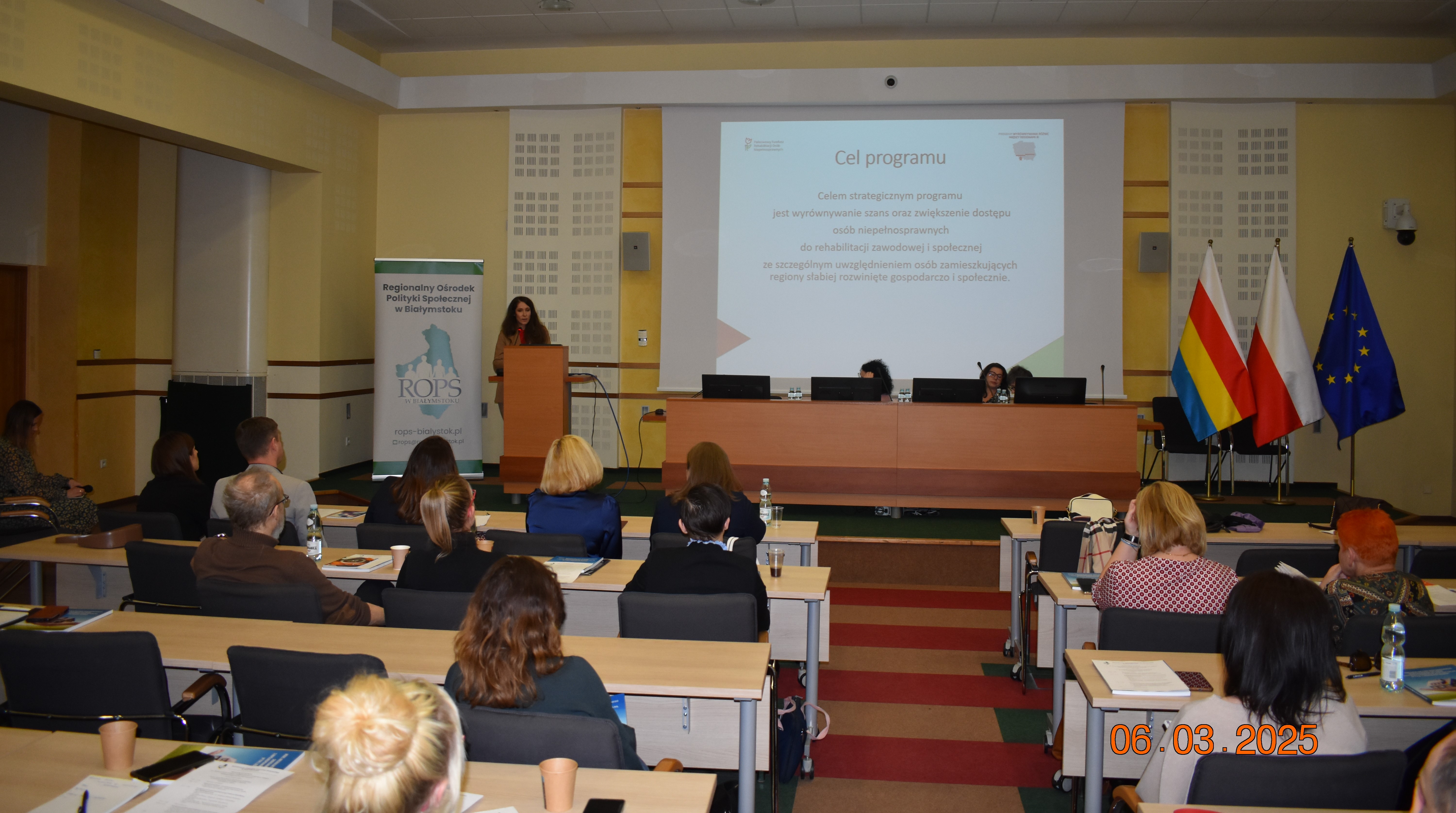 W dniu 6 marca 2025 r. w Auli im. Krzysztofa Putry w Urzędzie Marszałkowskim Województwa Podlaskiego odbyło się spotkanie organizowane przez Regionalny Ośrodek Polityki Społecznej w Białymstoku pt. „Wykorzystanie środków z budżetu państwa i programów PFRON na wsparcie placówek”. W wydarzeniu uczestniczyli przedstawiciele środowiskowych domów samopomocy z województwa podlaskiego oraz reprezentanci instytucji odpowiedzialnych za realizację polityki społecznej w regionie.