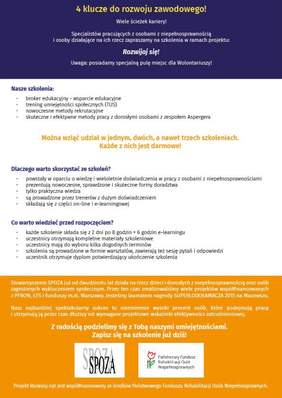 Stowarzyszenie SPOZA zaprasza specjalistów pracujących z osobami z niepełnosprawnościami i osoby działające na ich rzecz na bezpłatne szkolenia online.