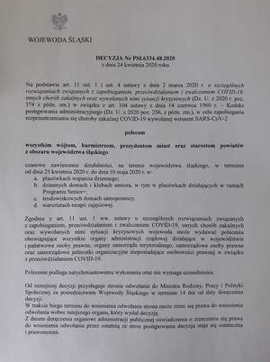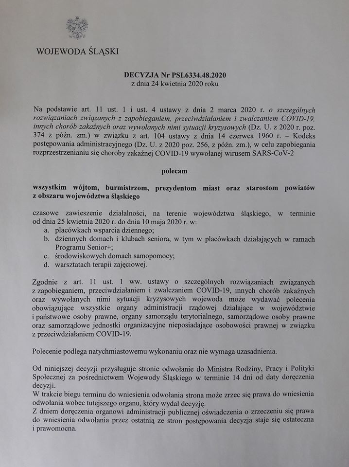 Wojewoda Śląski decyzją z dnia 24 kwietnia 2020 roku, podtrzymał zawieszenie działalności placówek z terenu województwa do 10 maja.