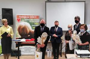 Dodatkowym punktem uroczystości było wręczenie przez Panią Aleksandrę Gierej nagrody dla Pana Sebastiana Florkiewicza za wyróżnienie, otrzymane w etapie wojewódzkim w konkursie plastycznym „Sztuka Osób Niepełnosprawnych” edycja XIX w kategorii „Malarstwo i witraż” za jego pracę pod tytułem „Aby dojść do nieba, trzeba oderwać się od ziemi”.