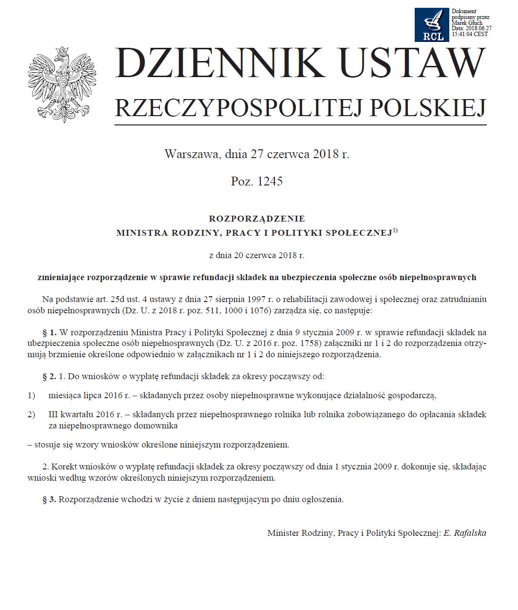 Rozporządzenie wprowadziło nowe wzory dokumentów składanych do Państwowego Funduszu Rehabilitacji Osób Niepełnosprawnych przy ubieganiu się o refundację składek na ubezpieczenia społeczne: